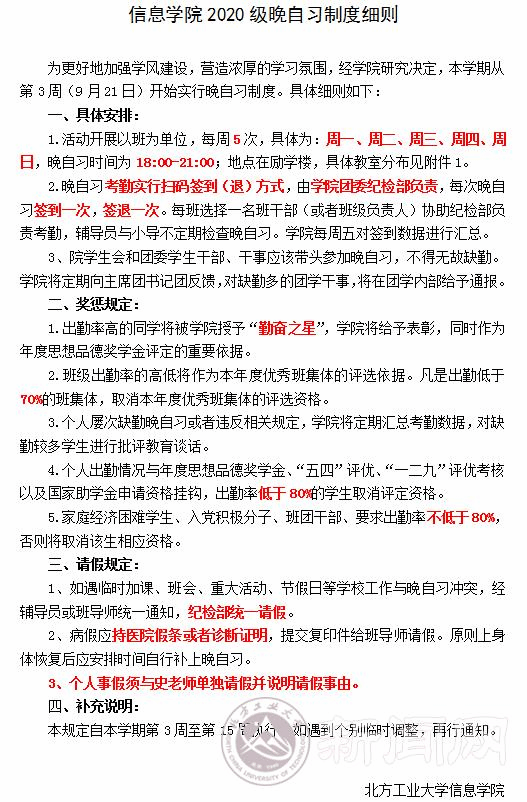 工欲善其事,必先利其器。信息學院在廣泛征求師生意見,認真做好工作調研的基礎上,從時間安排、請假流程、獎懲規定等方面修訂完善晚自習制度,培養學生制度意識,促進朋輩幫扶,培育晚自習文化。