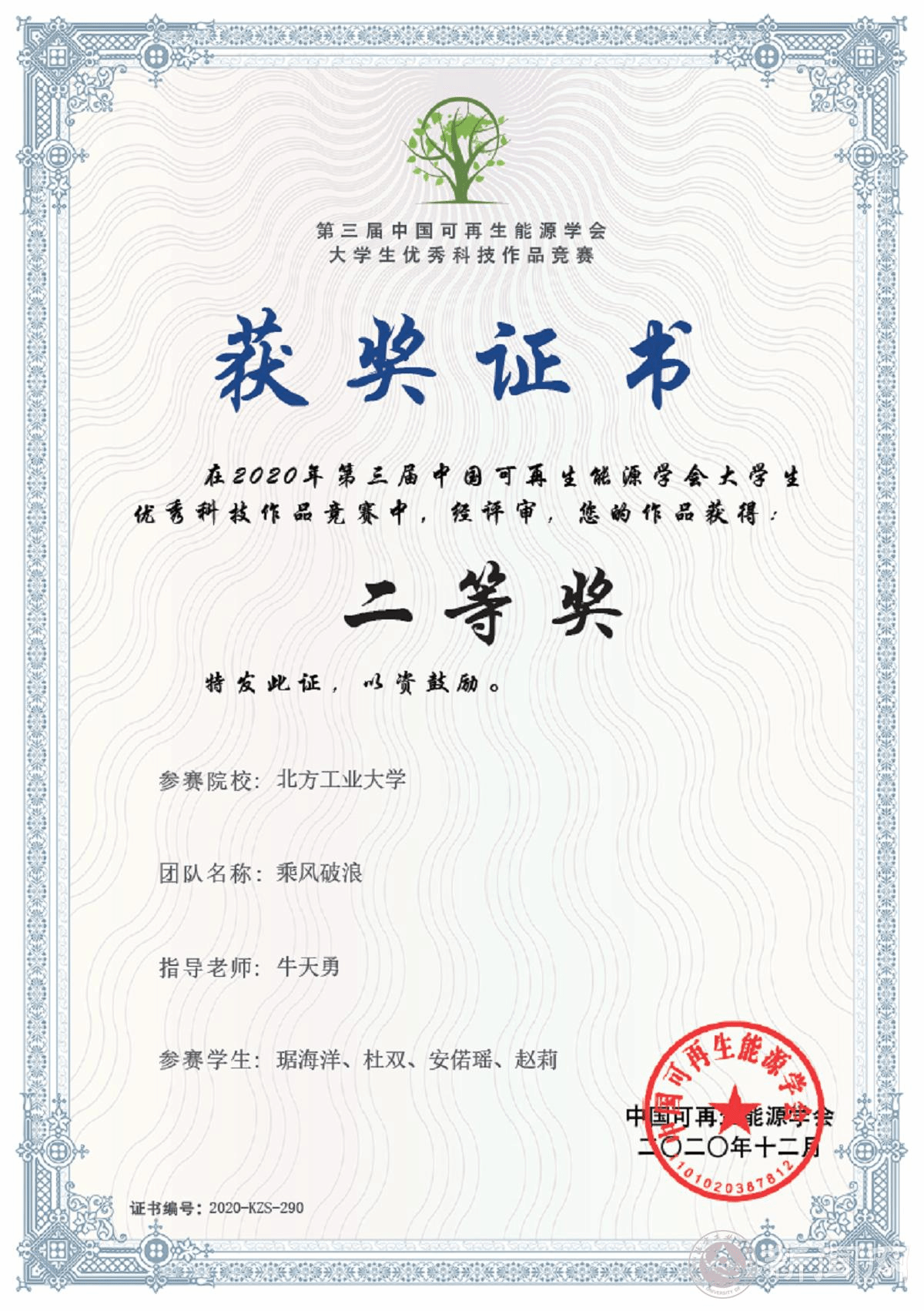 近日,由中國可再生能源學會主辦的第三屆中國可再生能源學會大學生優秀作品競賽決賽成功舉辦。來自華北電力大學、哈爾濱工業大學、中國農業大學、天津大學等120多所高校參與此次競賽。我校在比賽中獲得研究生組第二名的成績,榮獲二等獎。