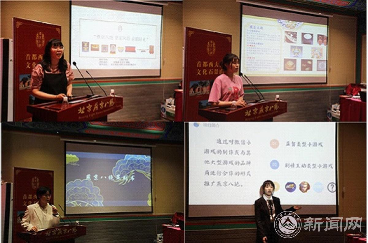 比賽中,六組參賽同學(xué)圍繞講好品牌故事、設(shè)計品牌元素、規(guī)劃品牌戰(zhàn)略三個不同的研究方向展開,以PPT的形式向評委展示了對“燕京八絕”非遺推廣的思路。各組同學(xué)結(jié)合所學(xué)專業(yè)知識為燕京八絕的推廣提出了很多具有建設(shè)性的意見,例如,設(shè)計卡通宣傳形象、開發(fā)燕京八絕小游戲、打造沉浸式廟會、將燕京八絕與科技融合等,參賽各組同學(xué)的想法別出心裁,從不同角度闡釋了學(xué)生們眼中的燕京八絕,形式新穎、內(nèi)涵豐富。