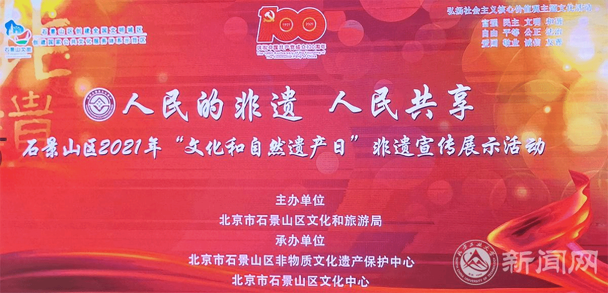 6月9日上午,主題為“人民的非遺人民共享”2021年石景山區“文化和自然遺產日”非遺宣傳展示活動暨石景山區非物質文化遺產保護中心開放啟動儀式在石景山區文化中心舉行,北京市文化和旅游局非遺處處長張遷,東城區文聯黨組書記、主席張志勇,北京文化藝術活動中心研究員、北京民間文藝家協會副主席石振懷,天津市非遺協會,石景山區相關單位領導共同參加了此次活動。我校經濟管理學院師生應邀在活動中展示非遺傳承傳播工作成果。