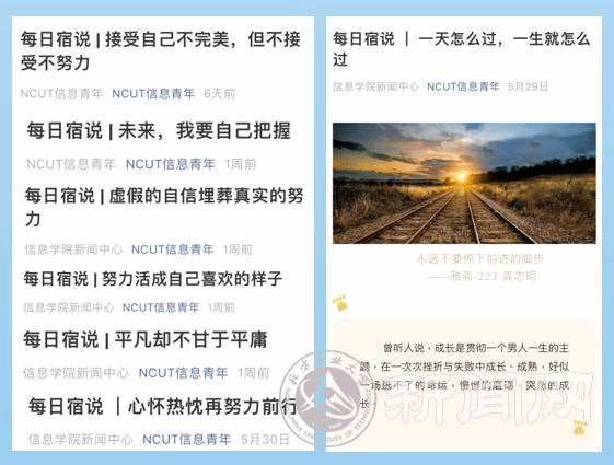 2021年4月,信息學院在前期“讀一本勵志書,開一個臥談會,寫一篇感想文”優(yōu)齋讀書計劃的基礎(chǔ)上,面向2020級全體宿舍征集優(yōu)秀讀后感,各宿舍積極響應(yīng)、踴躍參加,共收到100余篇共計約10萬字的讀后感,最終遴選出了18篇特別優(yōu)秀的感想。我們看到有同學從閱讀中產(chǎn)生了共情,慷慨激昂訴說故事;也有同學從書中看見頹廢的自己,落筆書寫出自己的心得;還有同學仿佛醍醐灌頂,清晰描繪美好未來。為更廣泛地傳播同學們讀書的所思所想,NCUT信息青年公眾號每日推送一篇優(yōu)秀文章“每日宿說”,促進讀書計劃的二次分享、深度分享。