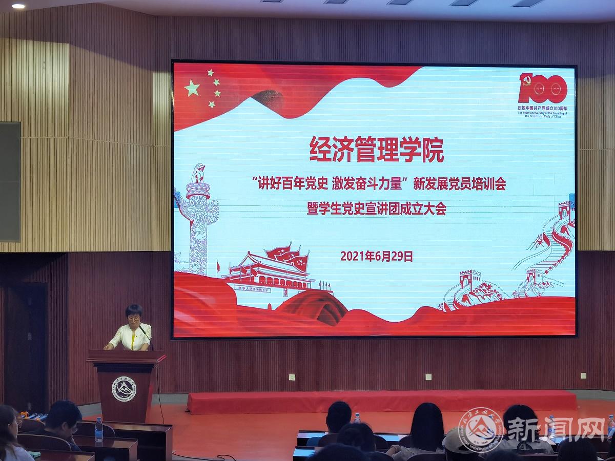百年征程波瀾壯闊,百年初心歷久彌堅。為了進一步開展好黨史學習教育,迎接中國共產黨成立100周年,引導廣大青年更好的學史明理、學史增信、學史崇德、學史力行,通過黨史學習教育自覺承擔起新時代的使命。經濟管理學院“講好百年黨史 激發奮斗力量”新發展黨員培訓會暨學生黨史宣講團成立大會于6月29日晚在文化會堂舉行。經濟管理學院黨委委員、各學生黨支部書記、各年級輔導員、新發展黨員參加了此次大會,會議由學院黨委副書記趙潔主持。
