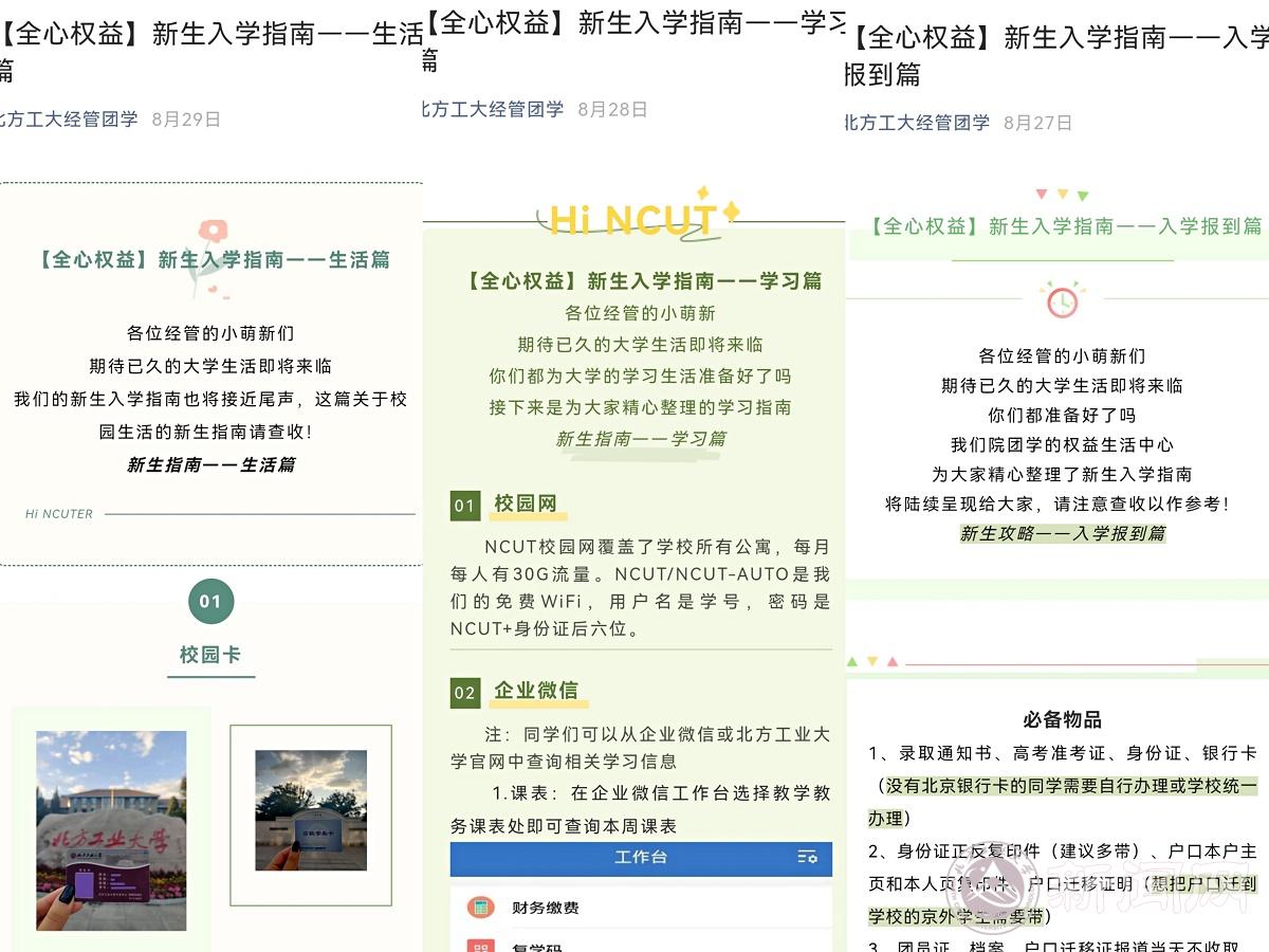 線上方面,學院“北方工大經管團學”微信公眾平臺在入學前針對新生需求與常見問題,推出迎新工作系列特輯,推送內容涵蓋入學報到、課程學習、校園生活等各項內容,同時“青春成長故事”特輯詳細介紹學院優秀學子奮斗向上的勵志故事,為新生提供了滿滿“干貨”。新生輔導員,班級小輔導員與同學們提前取得聯系、添加微信,并建立新生年級微信群、班級微信群,加強與新生的溝通聯絡,并在群里為同學們答疑解惑。