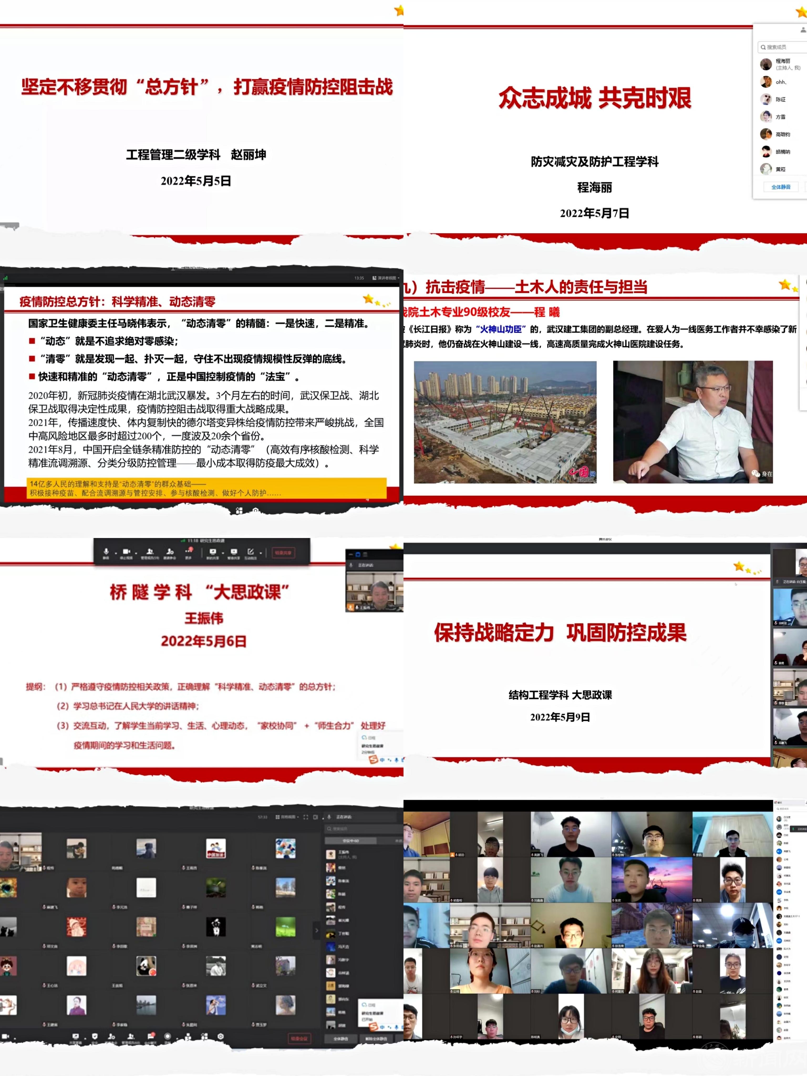 面對最近嚴峻復雜的疫情形勢,土木工程學院高度重視疫情防控工作,認真貫徹落實習近平總書記對疫情防控工作的重要指示精神和學校相關疫情防控政策,始終堅持人民至上、生命至上,堅持科學精準、動態清零,盡快遏制疫情擴散蔓延勢頭的疫情防控方針,密切關注特殊時期師生的思想動態,聚焦正確認識當前疫情形勢和政策深入開展宣傳教育,引導全體師生科學理性對待疫情,嚴格落實疫情防控要求,組織開展好疫情防控“大思政課”。