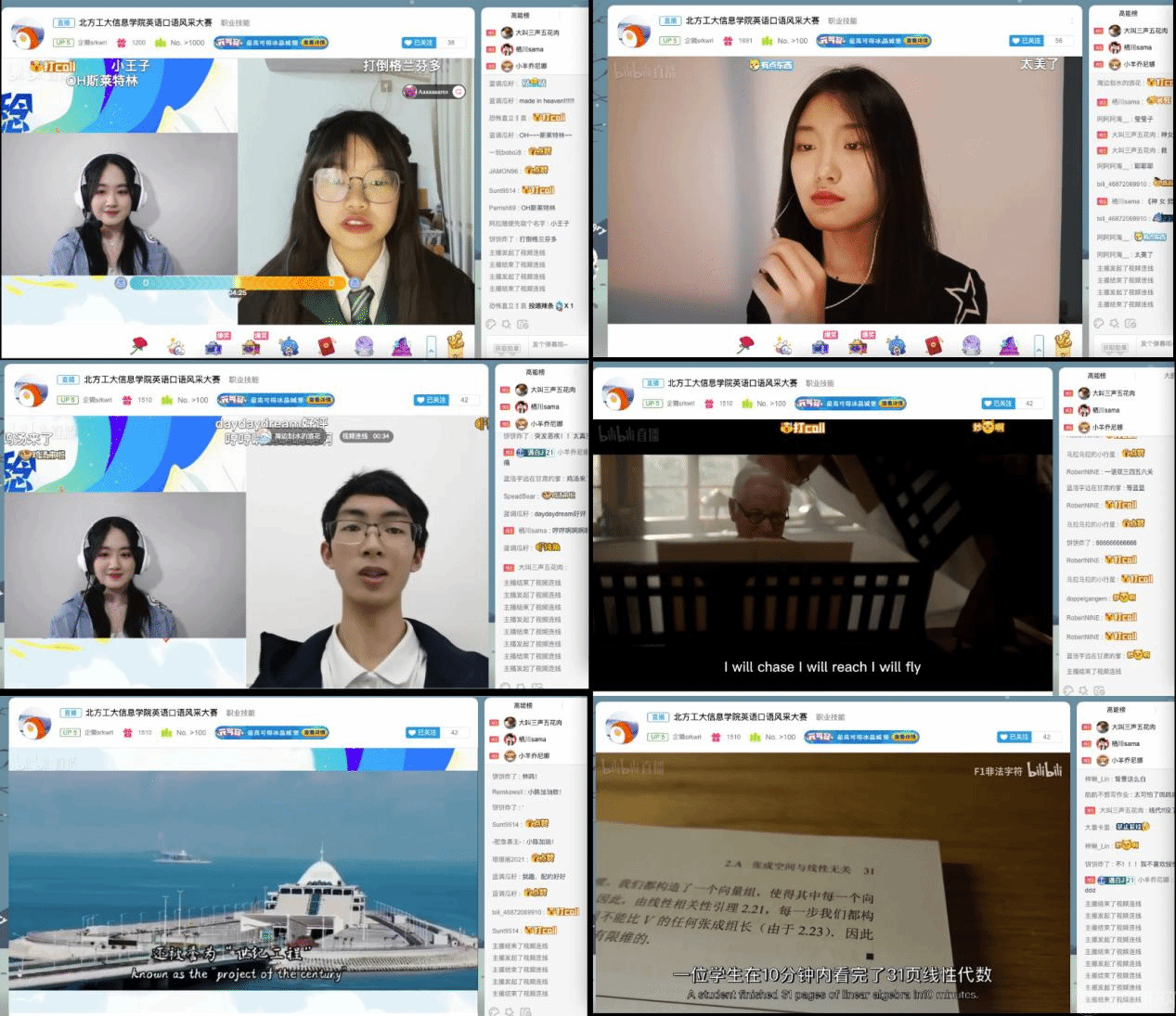 此次大賽由信息學院主辦,本科21級年級學生會承辦,初賽階段同學們踴躍參賽提交作品40余份,最終15名同學進入決賽。口語風采大賽決賽采用Bilibili線上直播方式,同學們以獨唱、朗誦、趣配音等豐富多樣的形式呈現作品,電實驗21班藍浩宇為華為探索者精神海外宣傳片配音,闡述了華為勇敢、拼搏、開放、合作的探索者文化;電實驗-20班陳慧婷朗誦了《港珠澳大橋》,用流利的口語介紹了這座連接香港、廣東珠海和澳門橋隧工程的建造背景和艱辛歷程;電20-3班趙文萱演唱了英文歌曲《Trouble is a Friend》,用清澈的嗓音鼓勵聽眾,雖然在生活中我們會遇到許多困難,但困難是激勵我們不斷前進的良藥,也是通往成功道路上不可或缺的伙伴;還有許多同學選擇了為《神探夏洛克》、《泰坦尼克號》、《瘋狂動物城》等經典影視片段配音。直播過程中,選手們表達流利,情感飽滿,為觀眾呈現了一場視覺和聽覺的盛宴。