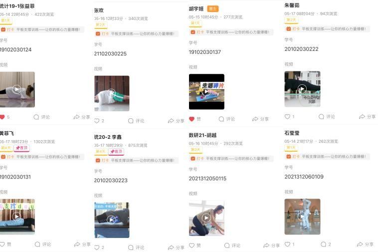 在第一階段的活動中,理學院號召參賽同學于5月14日-5月18日內(nèi)進行“平板支撐”力量訓練,并拍攝運動視頻與App截圖打卡,共收到來自361名同學的875次精美打卡視頻。并于5月19日,派出在第一階段打卡過程中積極備賽、堅持鍛煉的35名運動達人參加學校舉辦的騰訊會議線上挑戰(zhàn)賽。在此過程中,同學們積極關(guān)注、踴躍參與、認真準備,以持之以恒的鍛煉保持健康體魄,以酣暢飽滿的精神迎接美好未來。在打卡視頻中,同學們都十分認真,動作非常標準,展現(xiàn)了理院學子積極參與體育運動“拼搏,進取,青春,活力”的精神風貌,很多同學都養(yǎng)成了堅持鍛煉的好習慣。
