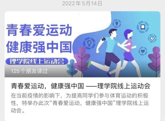本次“青春愛運動,健康強中國動”線上運動會第一期的成功舉辦,進一步豐富了學生線上文化生活,促進了和諧線上建設(shè),充分展現(xiàn)了理學院奮發(fā)向上、積極進取的精神風貌,凝聚起全力以赴的青年意志和青春正能量。第二期打卡也拉開了序幕,理學院全體同學將會以更加飽滿的精氣神去迎接新的挑戰(zhàn)再創(chuàng)佳績!