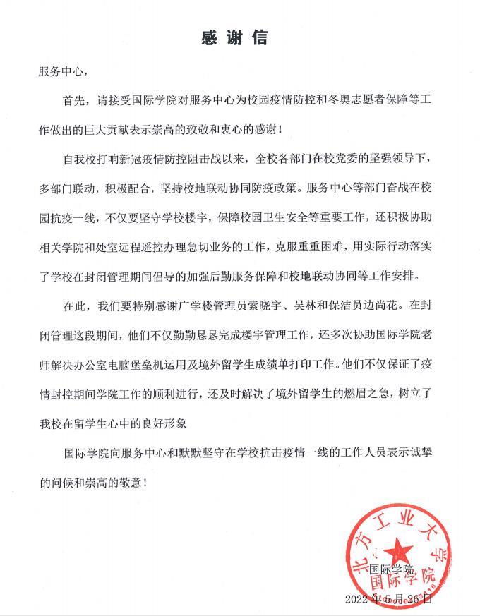 5月26日服務中心收到一封來自國際學院感謝信,對樓宇管理員跨崗位職責,盡心盡力提供幫助表示感謝。在校園封閉管理的特殊時期,樓宇管理員不僅要完成樓宇值守和設備巡檢等日常工作,還積極協助樓宇所在學院和處室遠程辦理各項業務。由于國際學院相關負責老師被封控在校外,留學生開具學習證明等材料成了難題。廣學樓管理員索曉宇、吳林,保潔員邊尚花擔當臨時辦事員,在國際學院老師的授權下,管理員打開相關設備,設置網絡連接,由國際學院老師遠程打印后,再由他們掃描文檔,線上交付給國際學院,為留學生解決了燃眉之急。