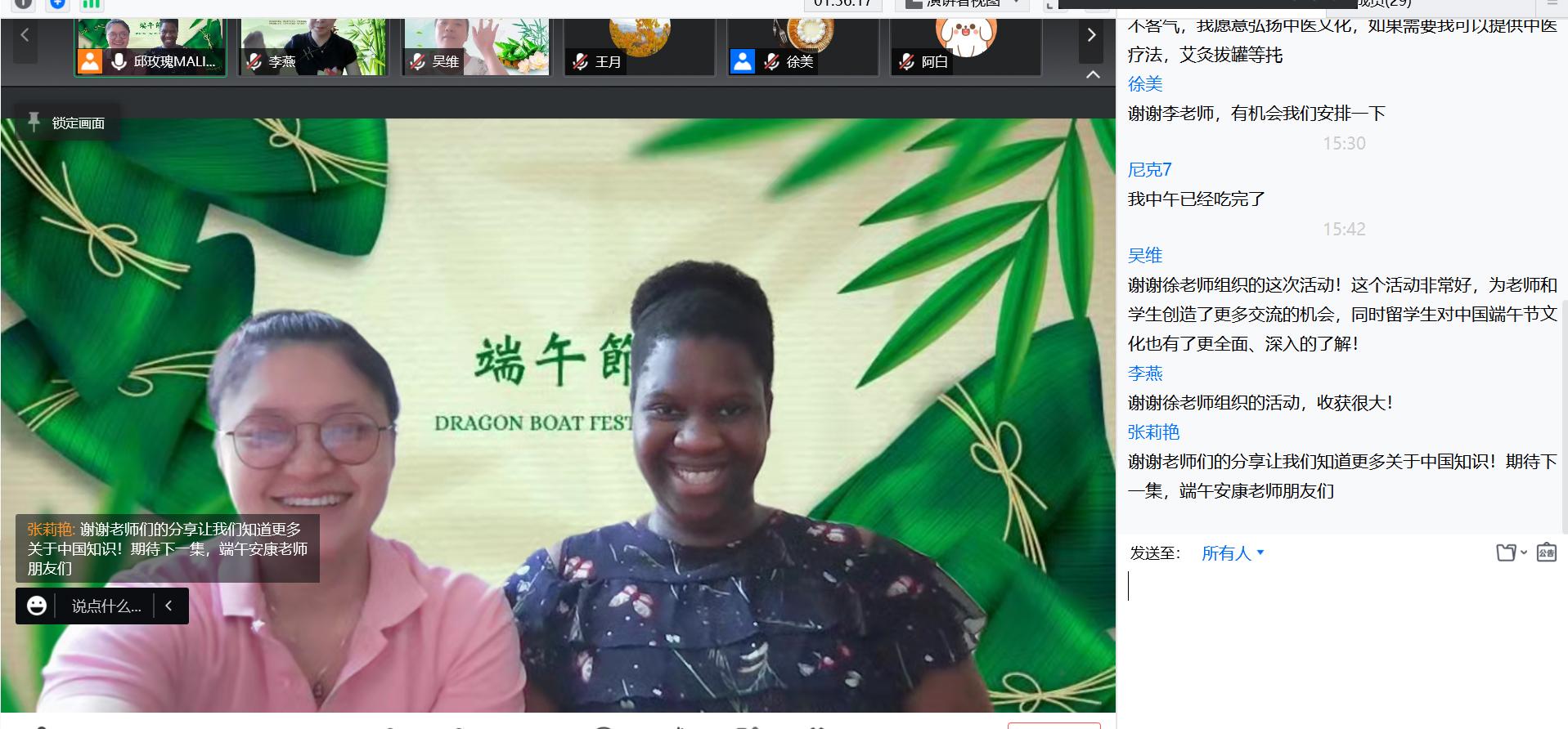 津巴布韋籍留學生歌真表示這次線上過端午節非常“獨一無二”,在學習各種知識的同時還交到了新的朋友,她感謝老師們精彩的演講和充滿熱情的展示,表示非常期待下一次活動。