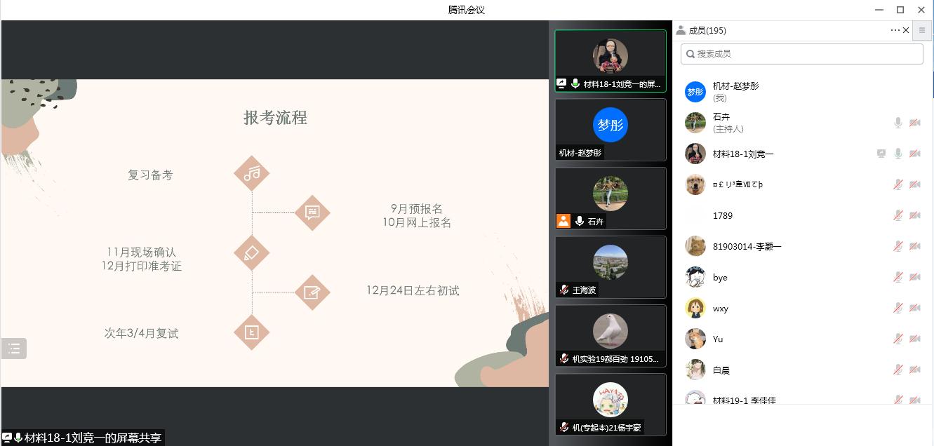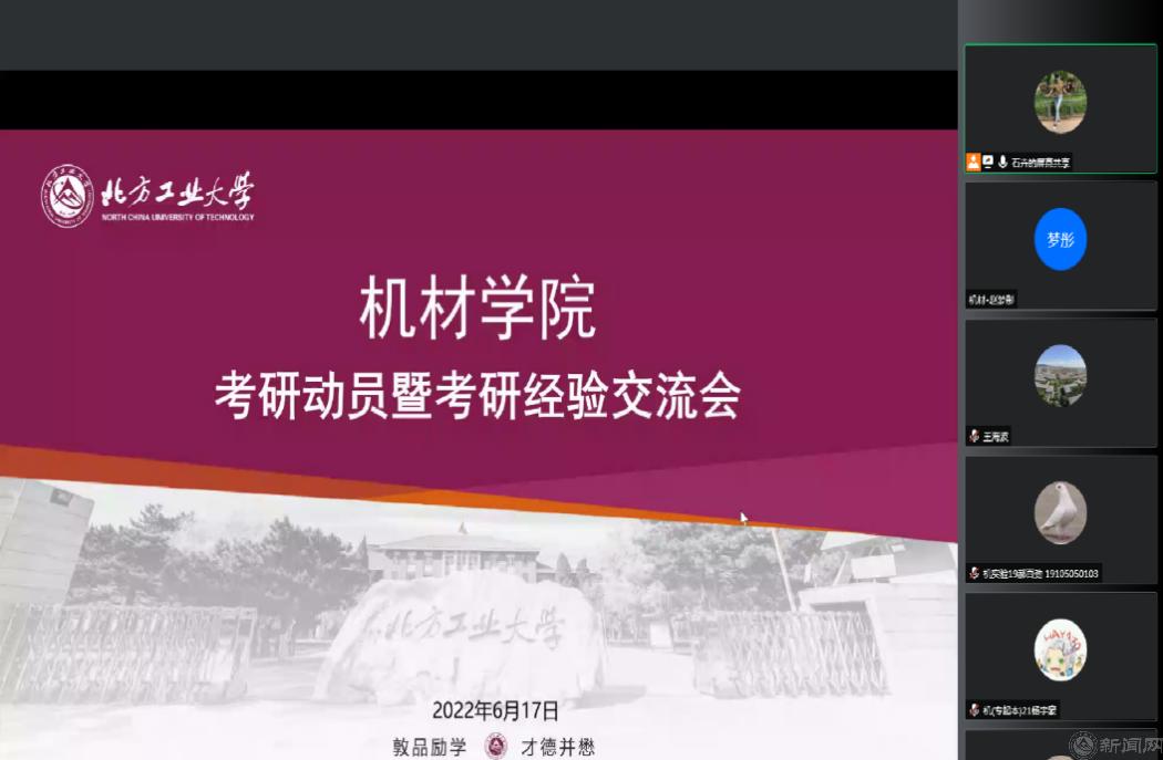 6月17日下午,機材學院在網上舉行2023屆考研動員大會。院長劉峰斌做考研動員,2名2022屆考取研究生代表學生做交流發言,學院黨委書記王文革作總結寄語。會議由黨委副書記石卉主持,2023屆全體考研學生、學院領導班子200余人參加本次活動。