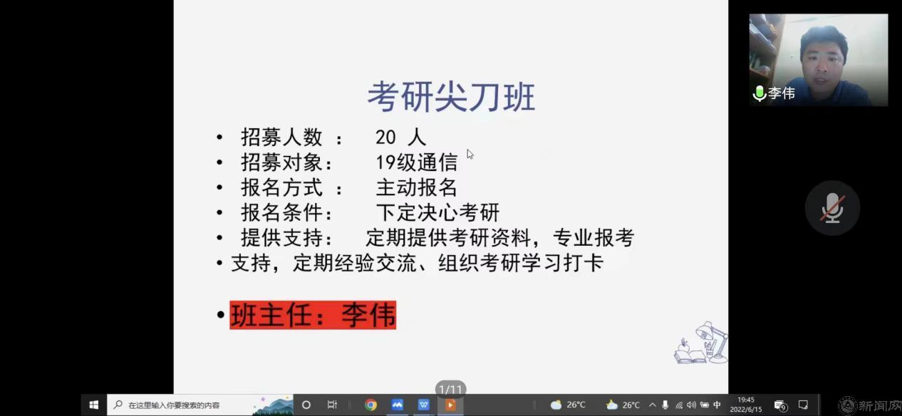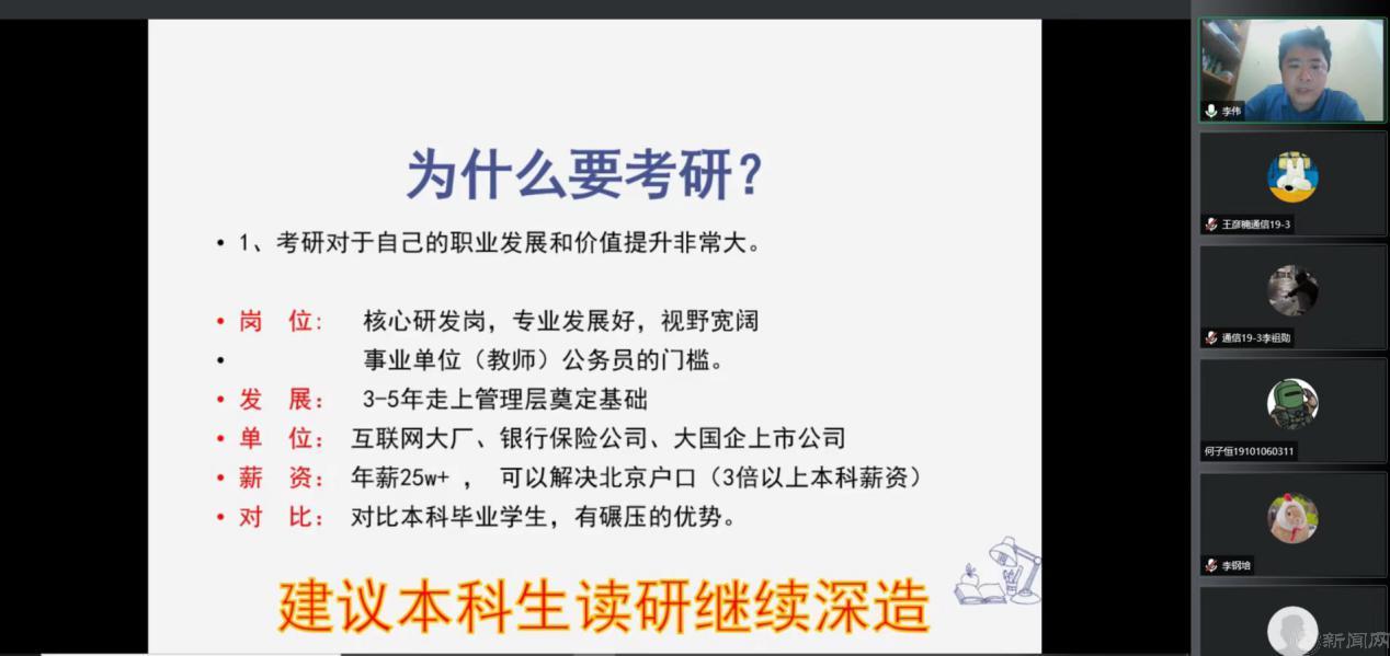 為進一步提振學生考研熱情和信心,引導學生明確考研目標,解答考研方面的疑惑,近日信息學院針對不同專業特點分場次、分專業召開了2019級學生考研動員大會。會議由2019級輔導員李偉老師主持、2019級全體班導師和學生參加。