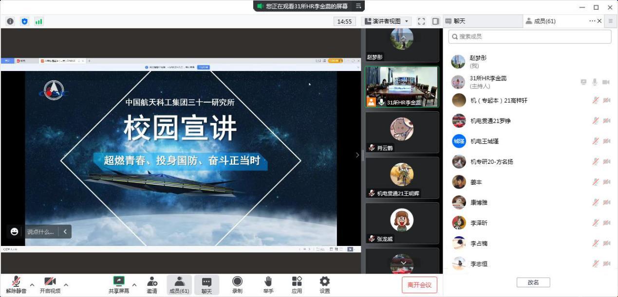 航天科工三院三十一所是我院在訪企拓崗促就業(yè)專項(xiàng)行動(dòng)中主推的優(yōu)質(zhì)就業(yè)單位。該所招聘工作崗位與我院所設(shè)專業(yè)契合度高。我院已有多名2022屆本科畢業(yè)生成功入職三十一所,助力中國(guó)航天夢(mèng)。10月28日,在三十一所的專場(chǎng)線上宣講會(huì)中,企業(yè)人力負(fù)責(zé)人圍繞研究所發(fā)展?fàn)顩r、招聘崗位、薪資待遇及培養(yǎng)晉升等學(xué)生關(guān)注的問(wèn)題給予了詳細(xì)介紹。崗位負(fù)責(zé)人對(duì)崗位職責(zé)、工作性質(zhì)與內(nèi)容進(jìn)行了深入講解,在線學(xué)生積極互動(dòng)、現(xiàn)場(chǎng)氣氛熱烈。