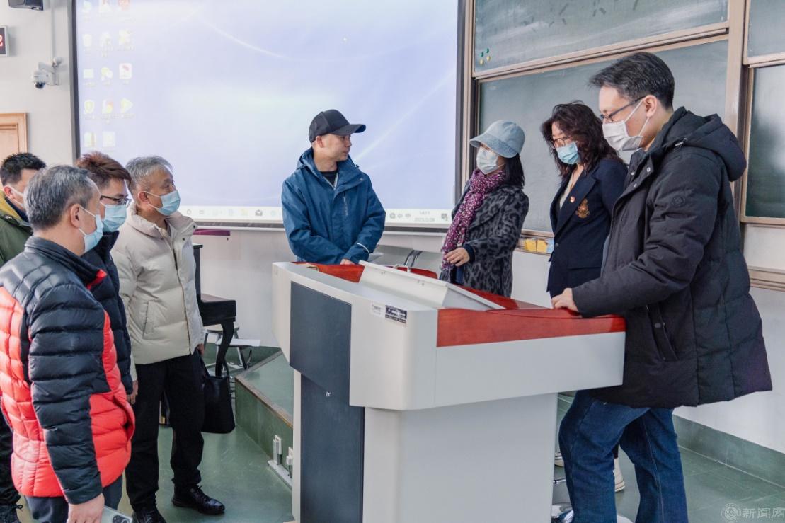 在李敏副主任、網信中心教育技術部負責人王岸飛的引領下,一行人先后前往廣學樓、瀚學樓和勵學樓教室現場觀摩、考察。李敏向來訪領導介紹了我校最近幾年的多媒體教室升級改造項目的相關情況及目前的現狀,王岸飛介紹了教室多媒體的系統構成、功能和特點,并進行了演示。