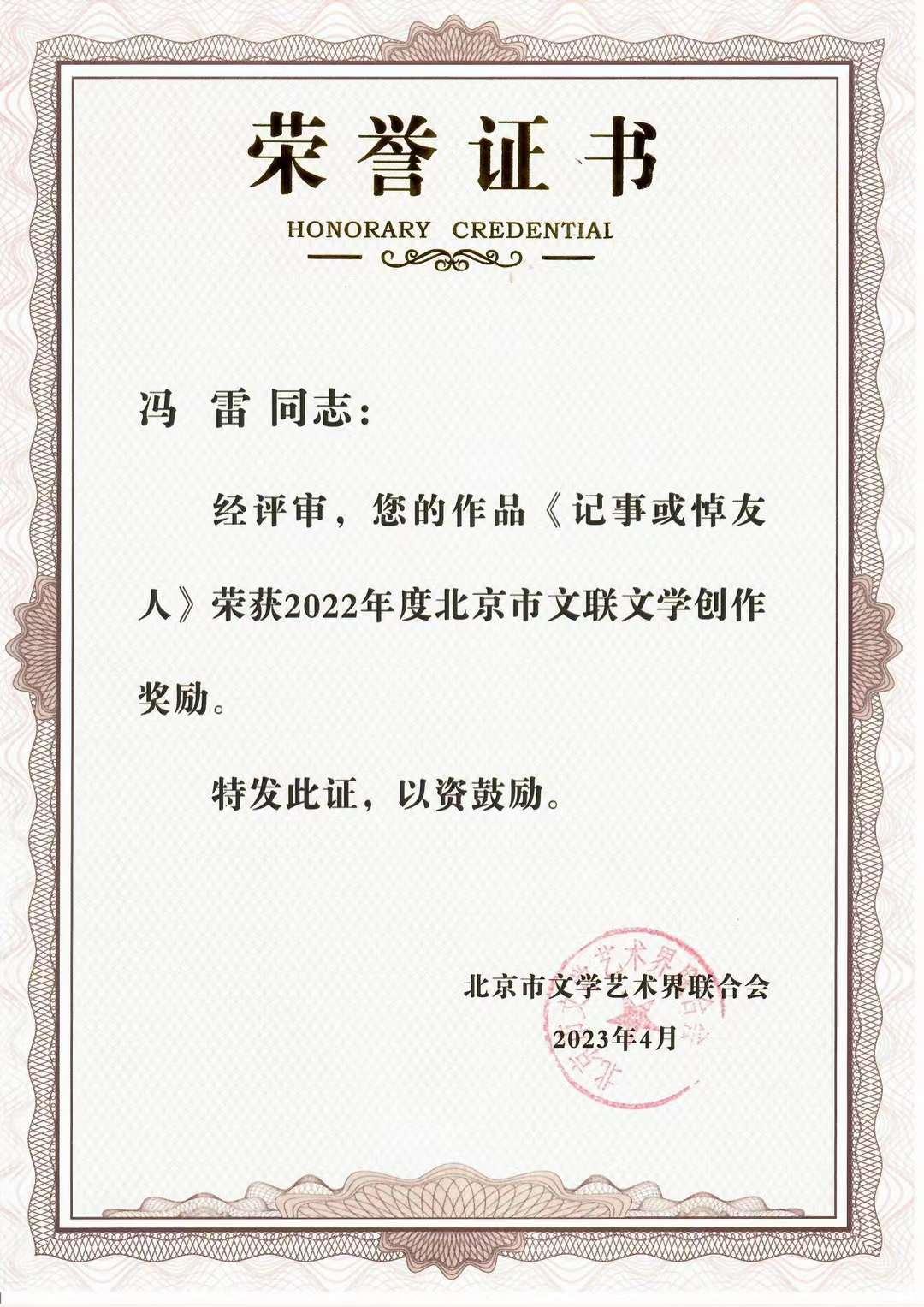 日前,北京市文學(xué)藝術(shù)聯(lián)合會(huì)在老舍劇場舉辦“2022年北京市文聯(lián)文學(xué)創(chuàng)作獎(jiǎng)勵(lì)頒獎(jiǎng)典禮”。我校文法學(xué)院馮雷副教授憑借文學(xué)作品《記事或悼友人》獲得獎(jiǎng)勵(lì),作品發(fā)表在《北京文學(xué)》2022年第3期。