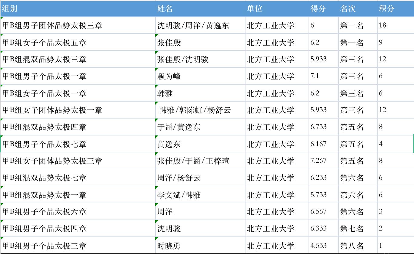 北方工業大學跆拳道隊在理學院體育系韓繼祥老師的帶領下,共13人出征。在此次運動會上,我校運動健兒們發揚“更快、更高、更強”的運動精神,奮勇拼搏,超越自我,最終取得2個第一名、4個第三名、3個第五名、3個第六名等14項個人獎項;沈明駿同學獲得“優秀運動員”稱號;北方工業大學跆拳道隊取得男子團體第八名的成績。