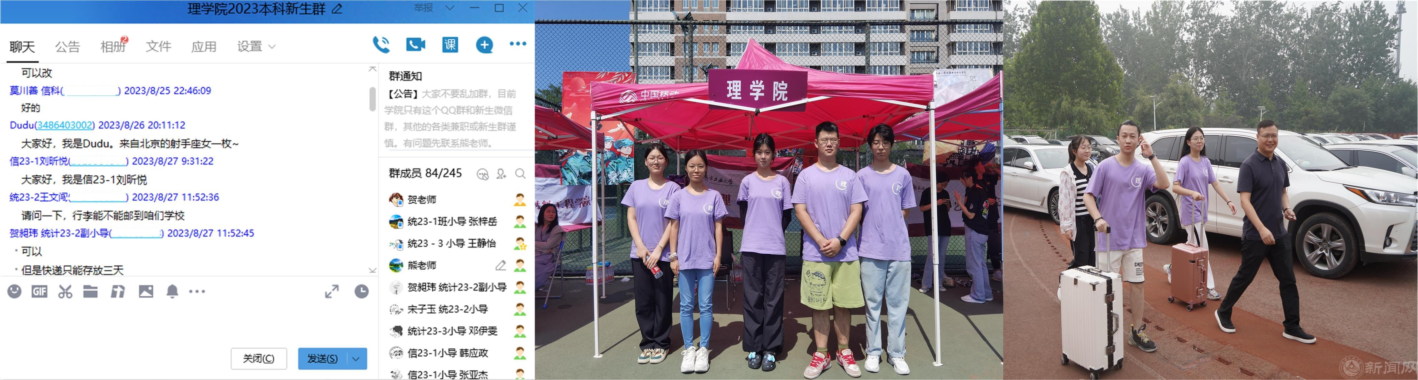 早在7月,學院就創建了“理學院2023級本科新生群”QQ群,方便新生咨詢。9月3日至4日,學院在小操場搭好帳篷、準備好小推車為提前入校放置行李的新生提供服務。
