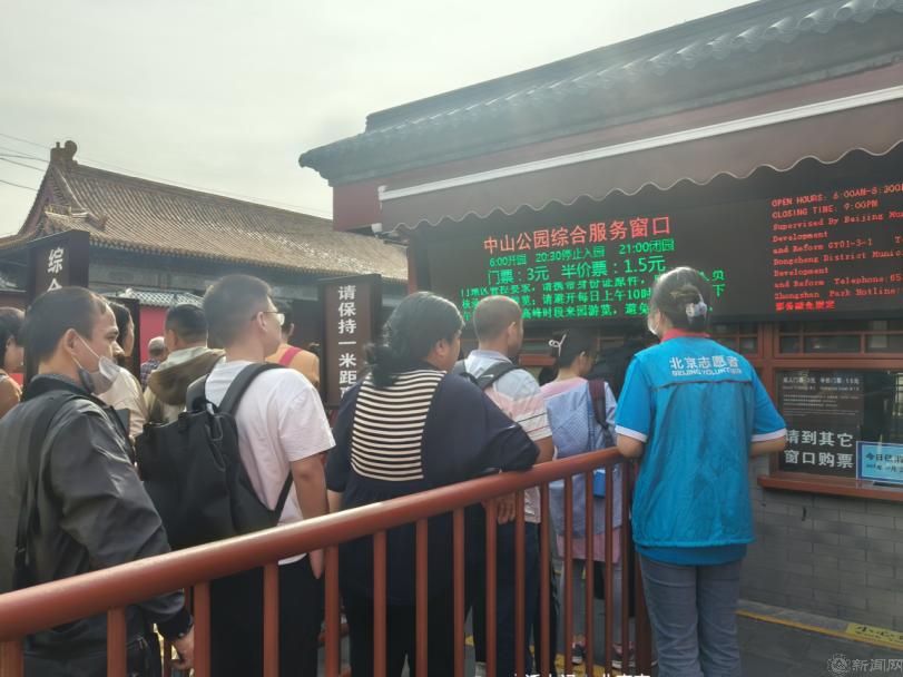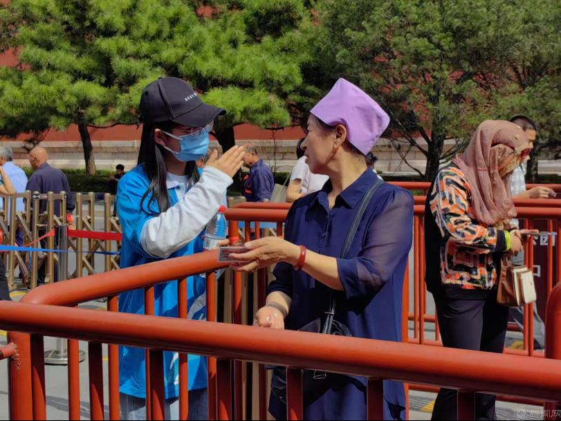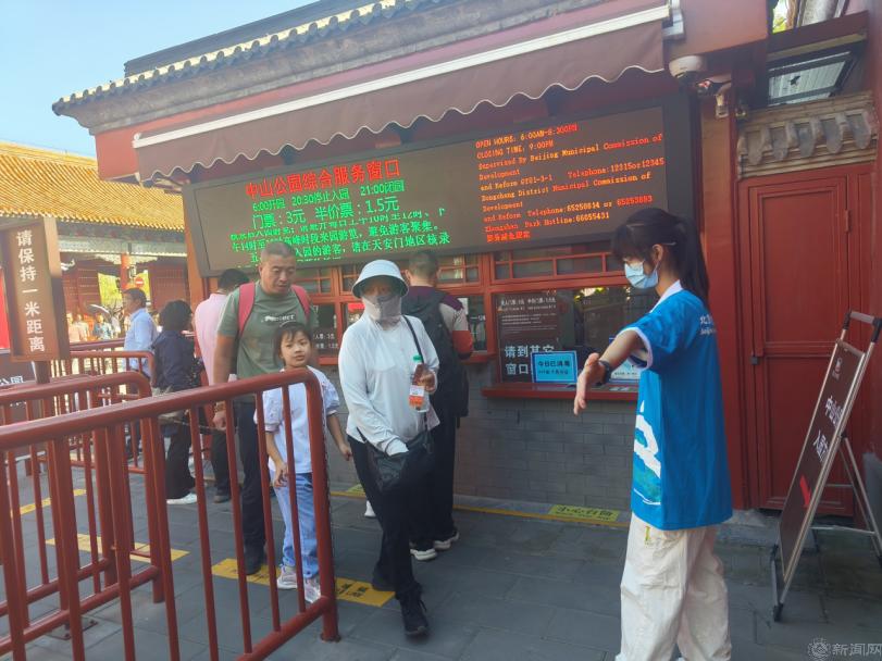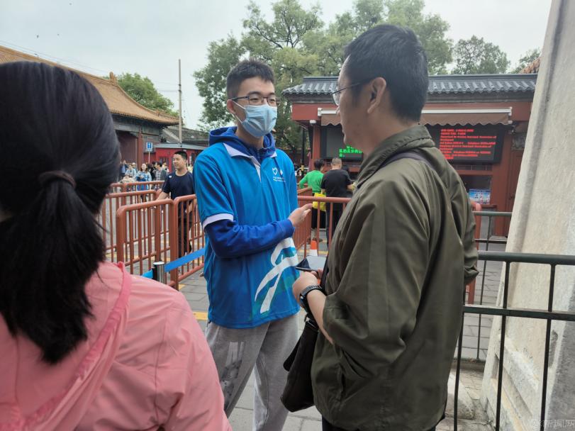 志愿者們身著藍馬甲,分別在中山公園、鼓樓進行引導游客、維持檢票秩序、解答游客問題等工作,充分展現出了北京青年學子的良好精神風貌。在中山公園西門的服務崗位上,志愿者們經常收到游客關于去北海公園的路線等旅游相關問題。志愿者合理設計路線圖給游客耐心精準指引,讓游客的出行變得更加便利。在中山公園東門,早上10點迎來買票高峰期,志愿者們崗位前置,提前告知游客與門票有關的注意事項,加快了買票的進度,減輕了園區工作人員的負擔。遇到語言不通的外國游客時,志愿者們會積極上前與他們溝通,協助他們購票并盡快進園參觀。