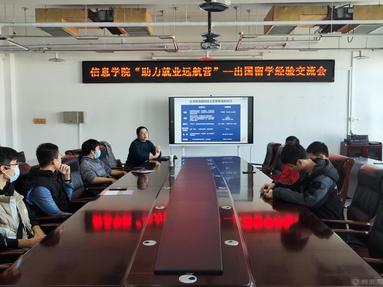 為助力學院國際化氛圍建設,加強學生對出國留學的認識和了解,幫助同學們更加深入了解出國留學項目具體要求。近期,信息學院舉辦“助力就業遠航營”系列活動之出國留學經驗交流會。活動邀請美國伊利諾伊大學芝加哥分校國際教育交流中心的高婧雅老師,為學生帶來了一場別開生面的出國留學經驗交流會。
