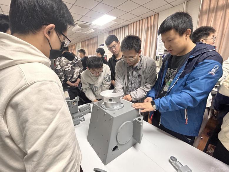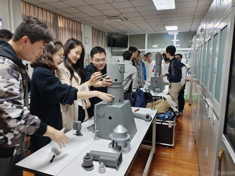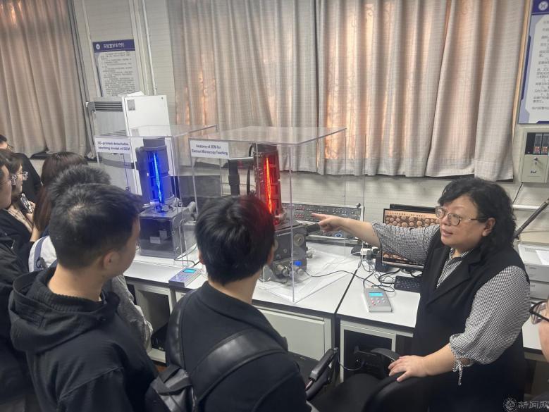在觀察與模型拆解環節,成員們操作電鏡,仔細觀察樣品成像情況,并根據崔老師講解內容和現場實物剖面光路分布情況,對電鏡模型進行拆解,強化知識記憶。