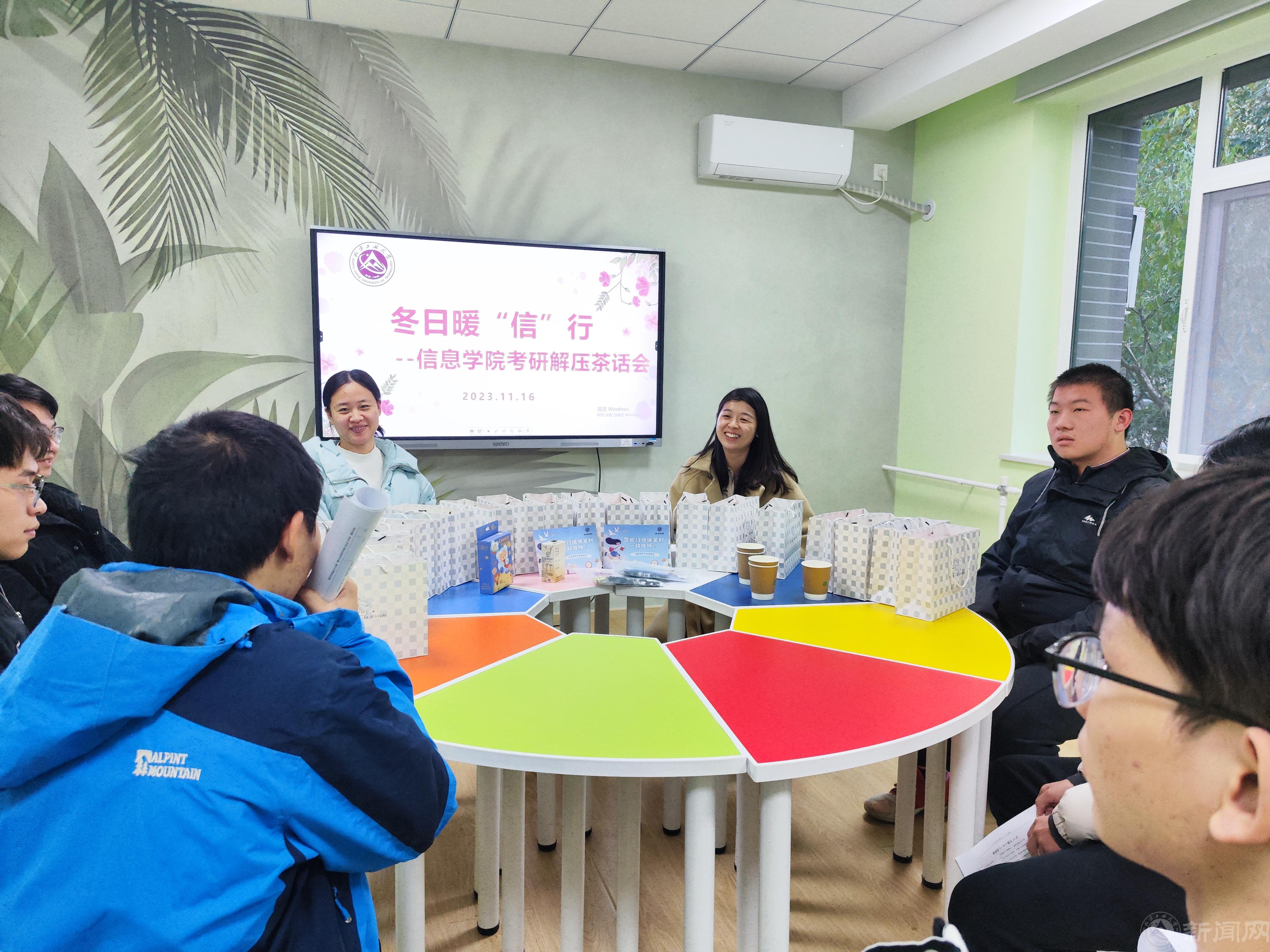 “人生漫漫而修遠,迷茫時有,疲憊時有。”為緩解同學們的考研壓力,明確奮斗目標,交流學習心得,幫助同學們以積極平穩的心態迎接2024年全國碩士研究生招生考試。11月16日,信息學院就業輔導員魏靜、輔導員陳煦婷邀請2024屆考研學生代表共聚心理咨詢中心113房間,展開了一場共憶與黃昏邂逅的考研解壓“茶話會”。