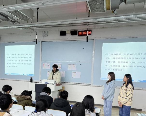為夯實學生思想教育體系,充分發揮班干部的示范引領作用,切實提升班干部的工作能力,從而強化學生們的凝聚力以及班級班風建設,信息學院舉辦了“頭雁領航”班級干部考評大賽。2023級電類全體學生參與活動,學院黨委副書記陳衛、2021級輔導員王秀吉、田慶玥老師及2023級輔導員崔怡冉老師參與評審。