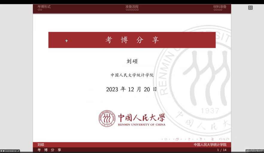 統計系2022屆校友劉碩同學就博士研究計劃、考博形式、考博流程等進行了詳細介紹。尤其對于考博流程,他按照時間順序,強調了不同時間段要準備的工作,包括聯系導師、準備材料、報名、準備復試等環節。
