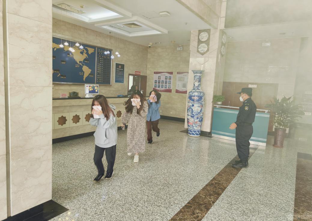 安穩部官鵬老師作了消防安全的主題宣講,詳細講解了火場逃生疏散技巧。國教中心住宿留學生及全體員工根據演練方案設定的疏散路線,用毛巾捂住口鼻,彎腰低姿的方式進行疏散,迅速從國教中心撤離到了志秀園廣場。