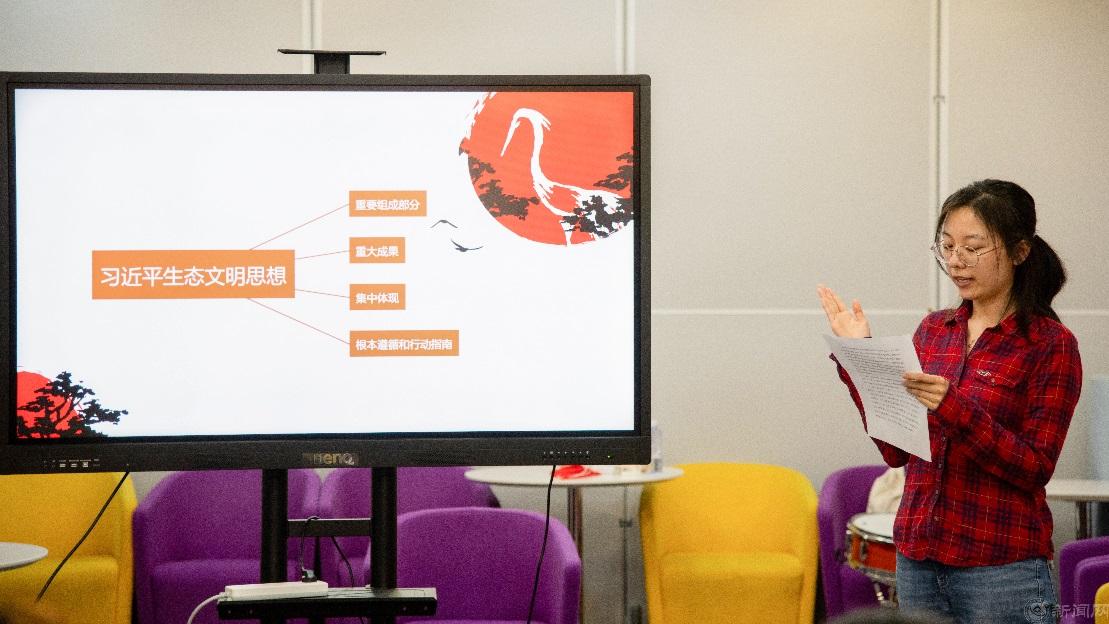 劉夢熒同學以“習近平生態文明思想的科學體系”為主題,帶領大家共同學習黨的二十大報告中關于推動綠色發展,促進人與自然和諧共生的生態文明思想。了解習近平生態文明思想,明晰其理論來源和現實依據,聯系現實生活中的案例,深入理解習近平生態文明思想的戰略路徑。她認為同學們應當發揮自己的專業優勢,把專業融入國家生態發展中,為建設人與自然和諧共生的中國式現代化貢獻力量。