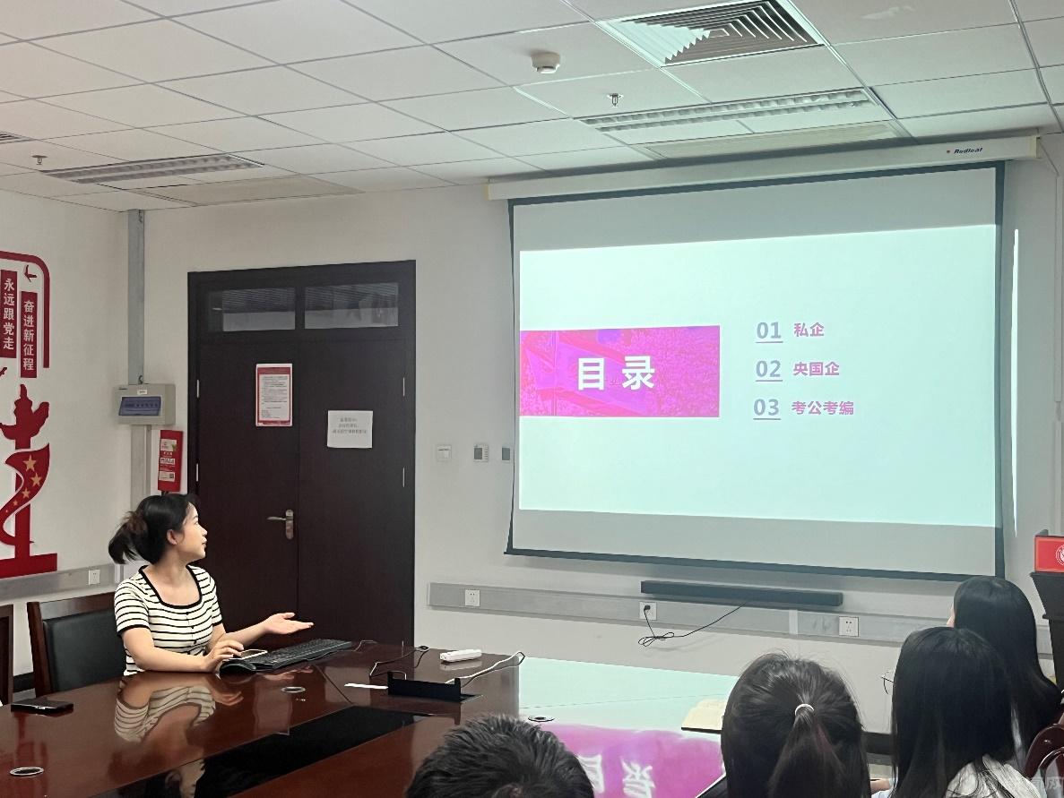 數學系謝漫鴻同學圍繞“我到底喜歡什么工作”“我到底適合什么工作”和“我到底能做什么工作”三個問題為同學們講述了她的求職經歷,她本人在私企、央國企都有豐富的實習經歷,在不斷的實習嘗試中逐漸找到適合自己的自己喜歡的工作,并建議大家盡早拿到教師資格證,并且可以去意向學校投簡歷提前實習,多關注北京各區的教師編招聘消息,最后她提醒各位同學一定要根據自身情況選擇就業城市、就業方向,之后要端正心態做出最適合自己的選擇。