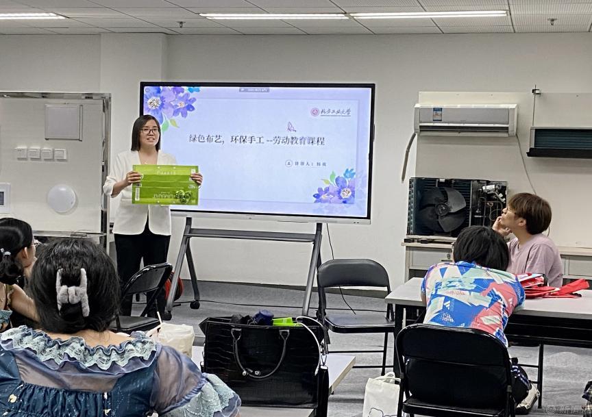 主講楊爽老師介紹了勞動教育的時代背景,以及我校開展勞動教育課程的實踐與探索。她圍繞綠色環(huán)保的典型案例,重點講解了環(huán)保手工制作公益勞動課程的意義,使同學(xué)們樹立綠色環(huán)保的價值觀。現(xiàn)場指導(dǎo)老師以外賣袋作為課程材料進(jìn)行演示,按照裁剪、折疊、定位、包邊到裝飾等流程,使同學(xué)們掌握了將外賣袋制作為壁飾作品的創(chuàng)意布藝的技能。