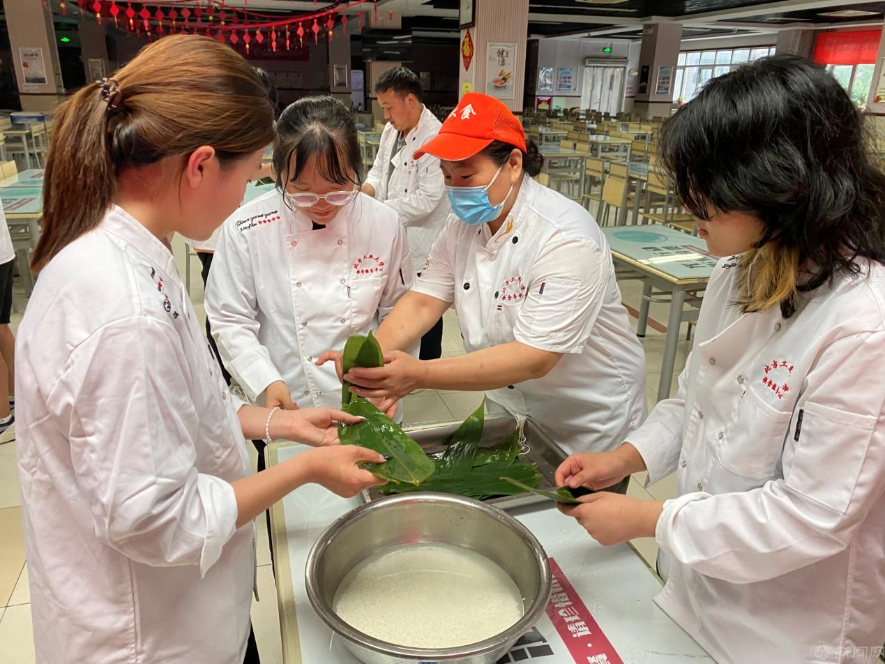 教工餐廳經理胡明學從端午節的起源、習俗開始講解,對飲食服務中心特色保障、服務育人以及取得的榮譽等方面工作進行簡要介紹。胡京雷師傅則從粽葉的挑選、糯米的浸泡技巧,到餡料的巧妙搭配和粽子的包扎方法,為同學們演示和講解包粽子的每一個步驟。