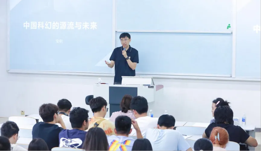 講座中,寶樹老師帶領現場的同學們穿越歷史長河,探索從西方科幻到中國科幻的發展歷程與現狀,從世界上第一本科幻小說《科學怪人》講到十九世紀工業革命時期科幻小說的黃金時代,再到二十世紀量子力學、相對論等科技革命對科幻文學的深刻影響,讓同學們對西方科幻有了更加全面且深入的了解。在講述中國科幻的發展歷程時,寶樹從魯迅翻譯凡爾納作品開始講起,介紹了從晚清時期到21世紀科幻文學的發展,鼓勵同學們要敢于想象并積極投身科幻創作之中。