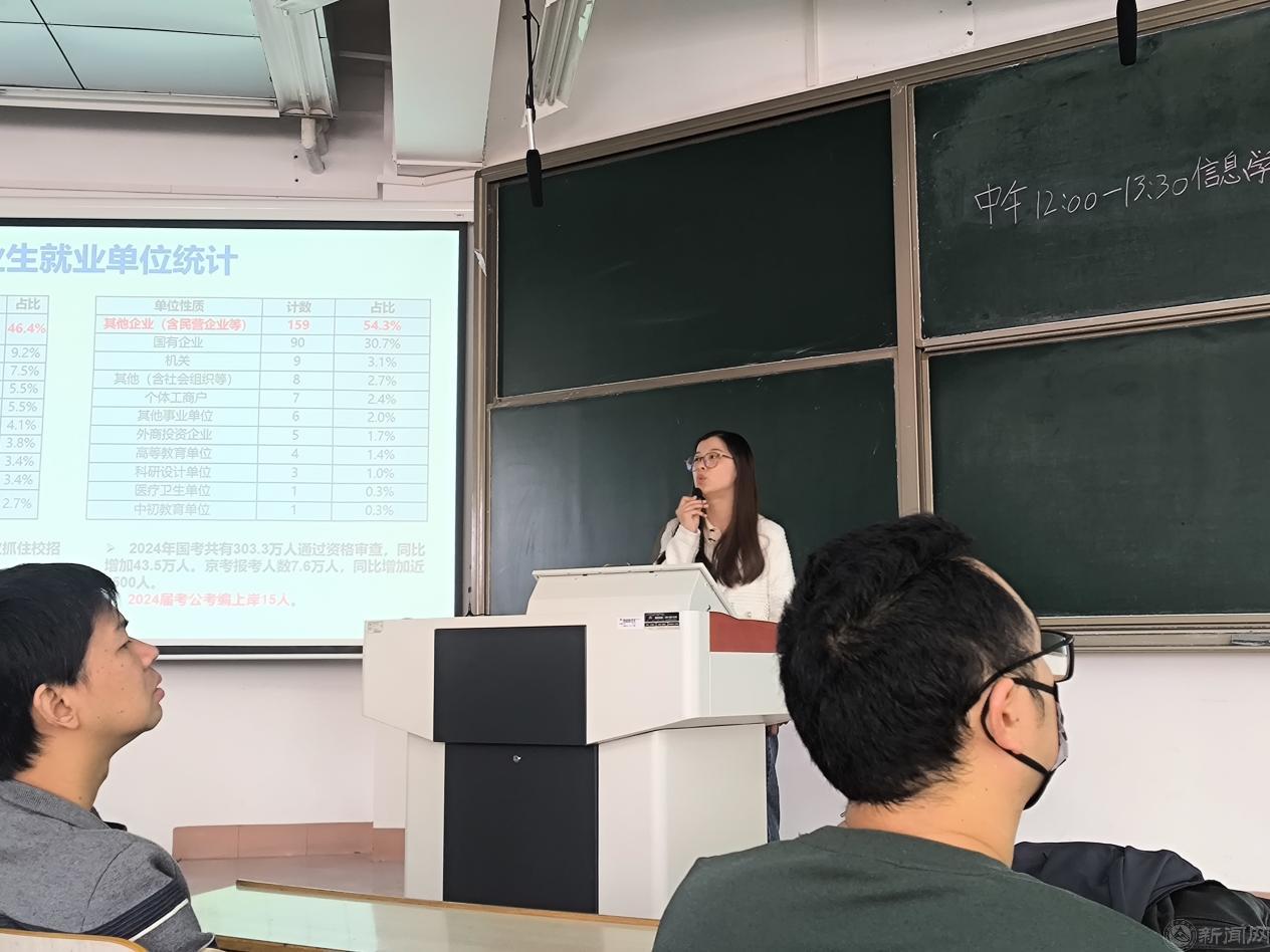 輔導員田慶玥、魏靜分別向畢業生講解2024屆各專業學生考研就業具體情況、就業系統的使用、三方的簽約流程等事項,讓同學們對自己的前途有了更加清醒的認識。