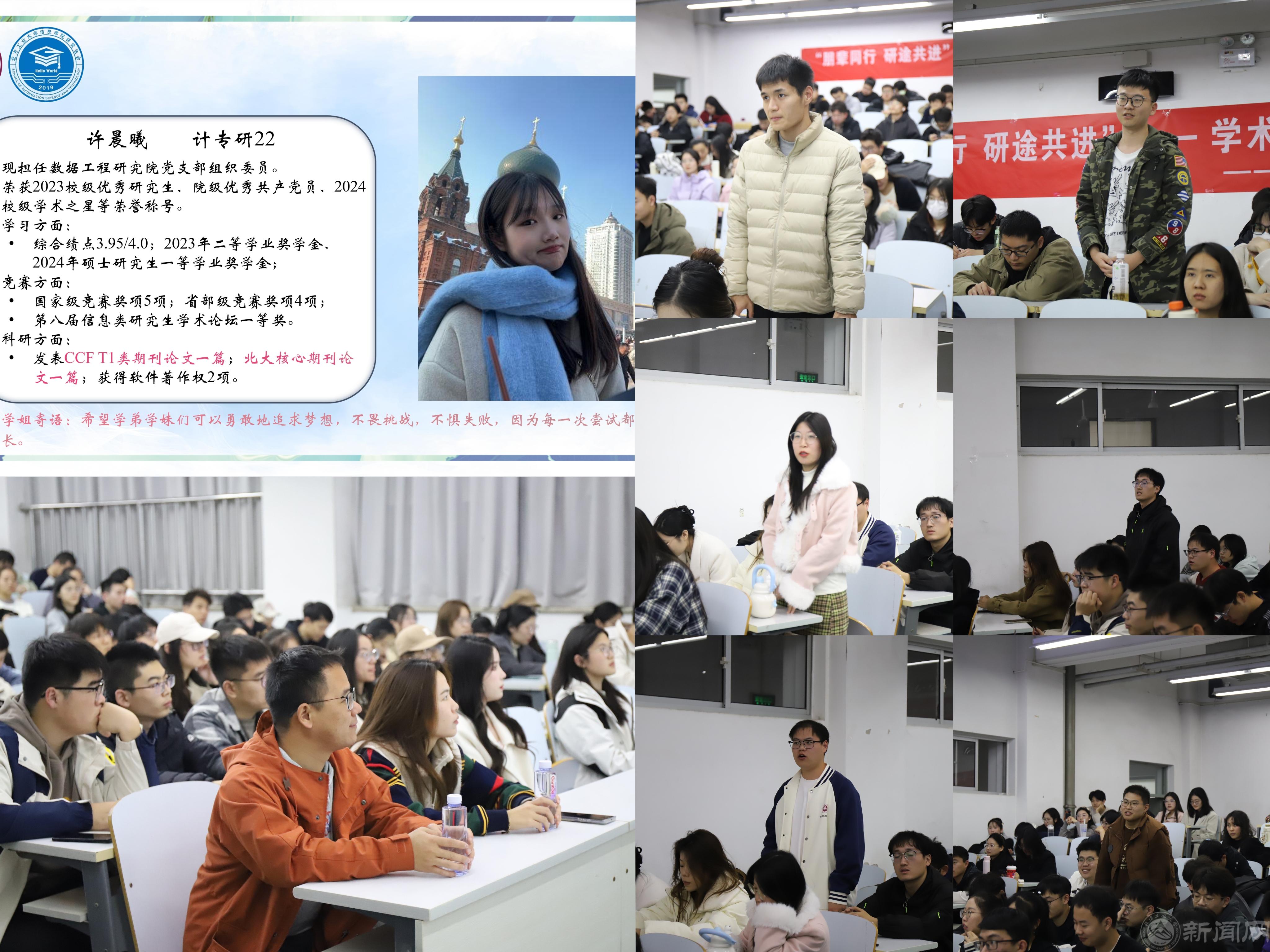第一場分享會邀請了計專研-22程鵬燕、鄔毅杰、通信專研-22趙甲萌為同學們進行分享。程鵬燕以“如何明確個人目標?”為切入點,為同學們提供了一份詳盡的讀研規劃指南;鄔毅杰以“研究生生活與科研的雙重探索”為主題,圍繞“課程學習、專業實習、文章發表、興趣愛好”四大維度,向與會者分享個人經驗與心得;趙甲萌在分享會上強調,快速掌握學術研究所需的軟件技能至關重要,這將有助于將創新思維迅速轉化為實際的論文成果。她建議同學們要在繁忙的工作與學業之間找到平衡點,保持一顆積極樂觀的心態,以應對各種挑戰。