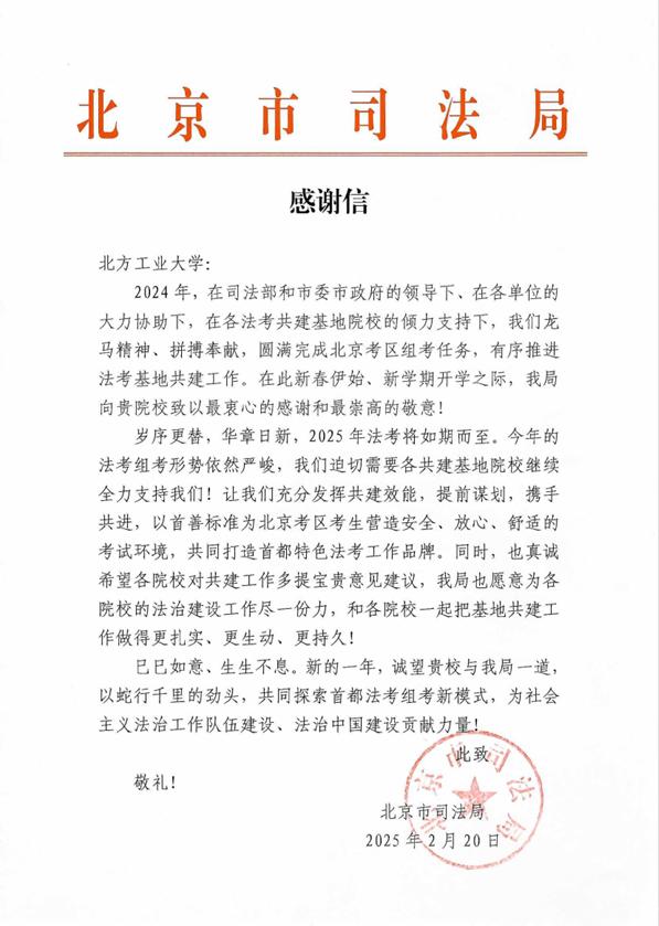 近日,北京市司法局向我校發來感謝信,對我校在國家統一法律職業資格考試北京考區組考工作中作出的重要貢獻給予高度評價,并致以新春祝福與表達深化合作愿景。