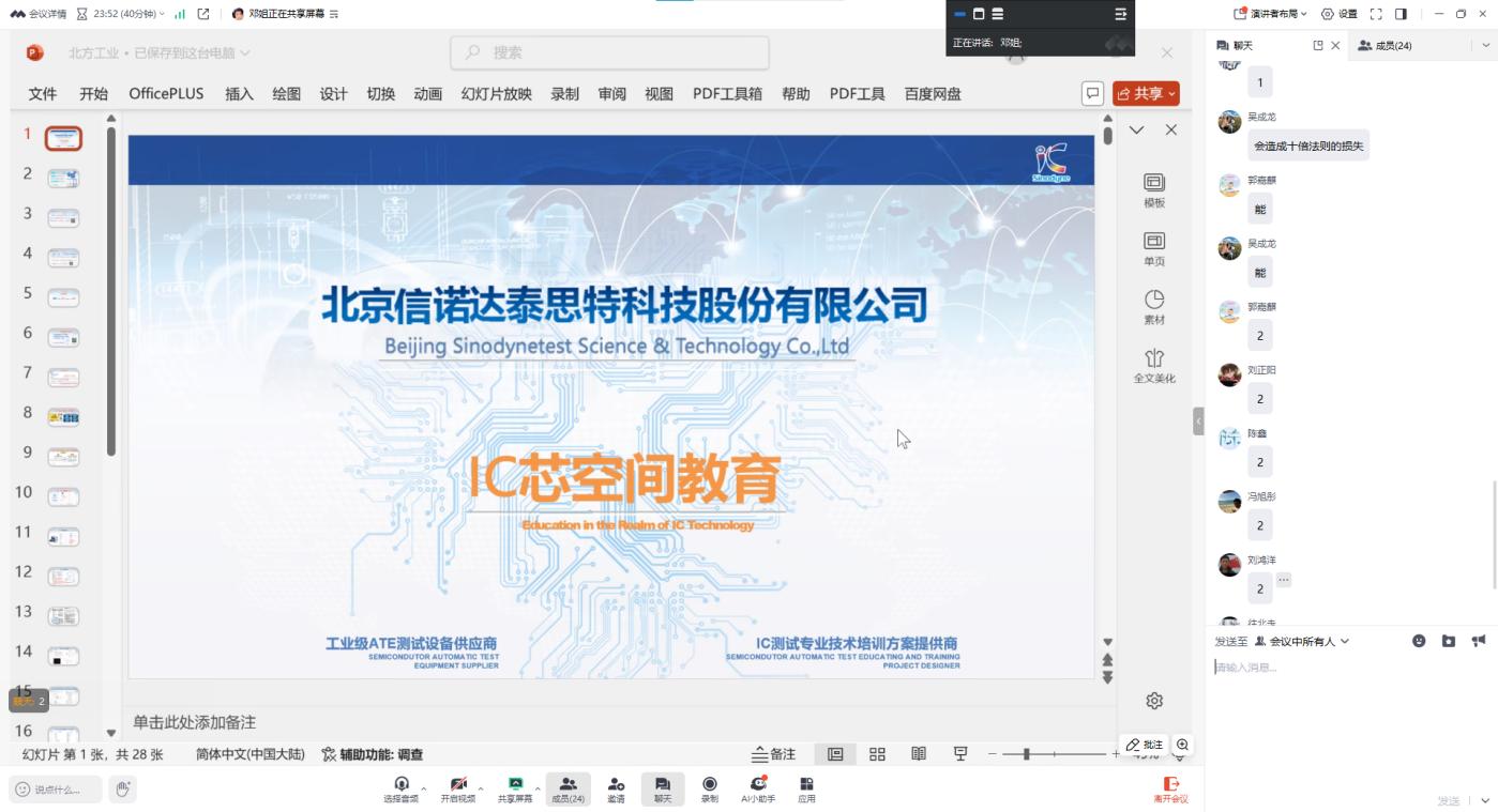 此外,北京信諾達科技有限公司鄧亞芬、集成電路學院系主任魏淑華、輔導員王鑫淼以及學院學生通過線上形式進行互動交流。鄧亞芬老師通過問答形式向參會學生介紹信諾達科技有限公司在芯片設計、集成電路測試等領域的技術優勢,并詳細講解“信諾達杯”的競賽背景及參賽所需的關鍵能力。還對參會學生提供一對一簡歷輔導,分享就業、面試技巧。鄧亞芬老師以豐富的行業經驗和深刻見解,鼓勵學生積極參與專業賽事,提升自身的專業能力和團隊協作力,為未來職業發展奠定堅實基礎。
