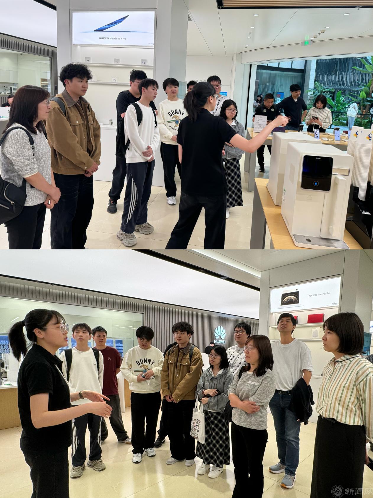 師生一行首先來到華為客戶服務中心,在店長白興陪同下,實地參觀智能設備檢測維修區、客戶接待區及技術支持中心,沉浸式體驗華為“端到端”服務生態體系。白店長詳細介紹了AI智能診斷系統、5G寄修服務網絡、數據安全遷移等核心技術應用,展示了華為在售后服務領域的智能化、標準化運作模式。