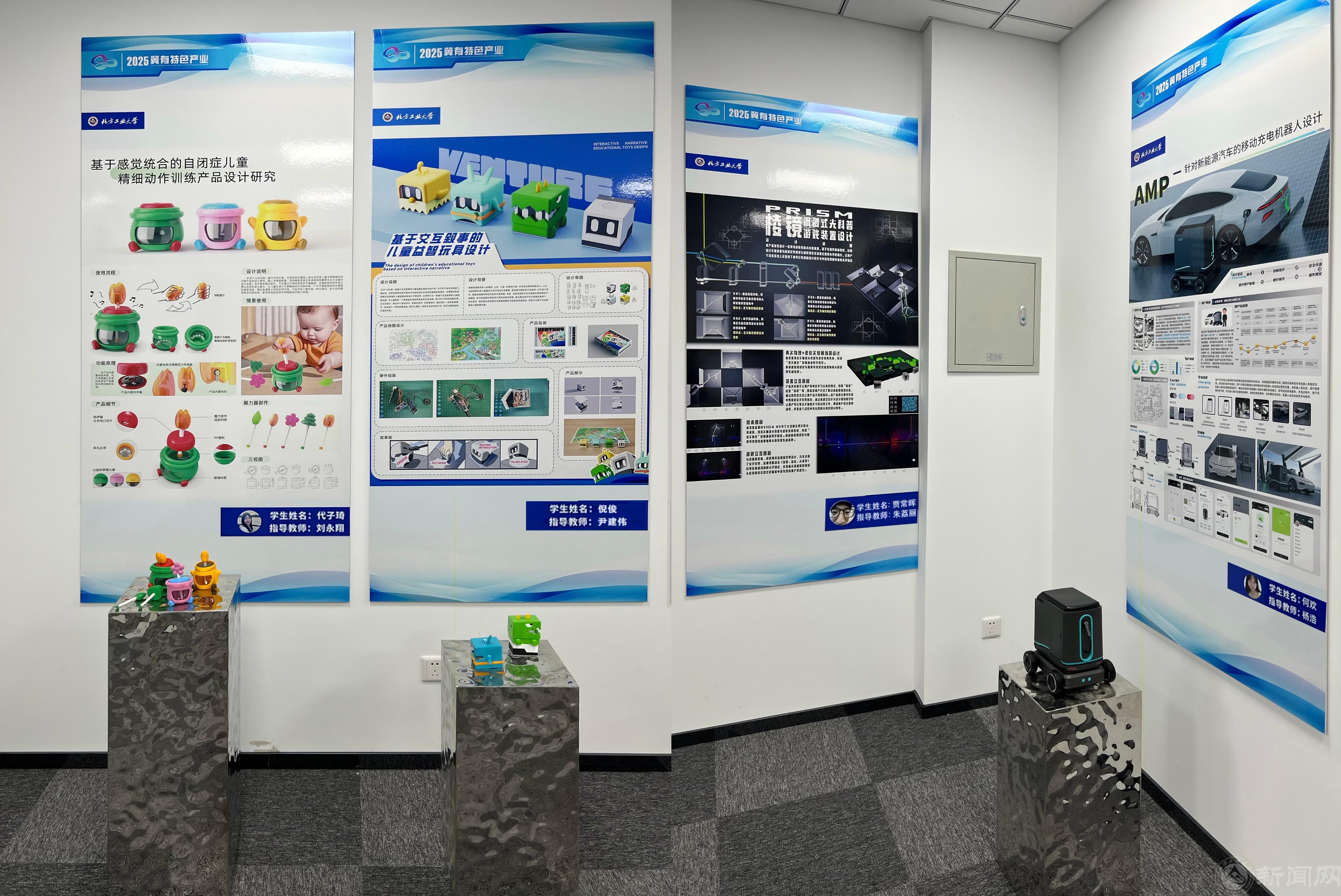 由我校工業設計專業選送的2份本科畢業設計作品、3份研究生畢業設計作品參加了展覽。各畢業設計從充電機器人等選題入手,定義使用人群、應用場景,產出了包括外觀、結構、使用方式、服務系統等一系列解決方案。通過靜態展板、掃碼視頻和實物模型等方式展示,各作品表達出學生對新質生產力的深刻理解、新技術新消費模式的敏銳洞察和包容性可持續社會的不懈追求,獲得觀眾的一致認可。