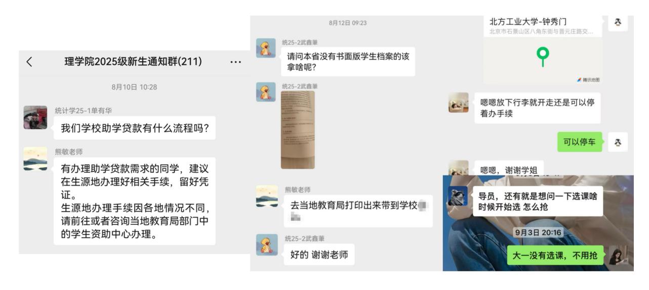 8月初,學(xué)院即建立新生QQ群和微信群,打造實(shí)時高效的師生交流平臺。專業(yè)教師和優(yōu)秀學(xué)長學(xué)姐持續(xù)在線,及時回應(yīng)新生各類疑問,從選課指導(dǎo)到生活貼士,以理學(xué)院人特有的嚴(yán)謹(jǐn)與熱情,陪伴新生順利過渡大學(xué)生活。