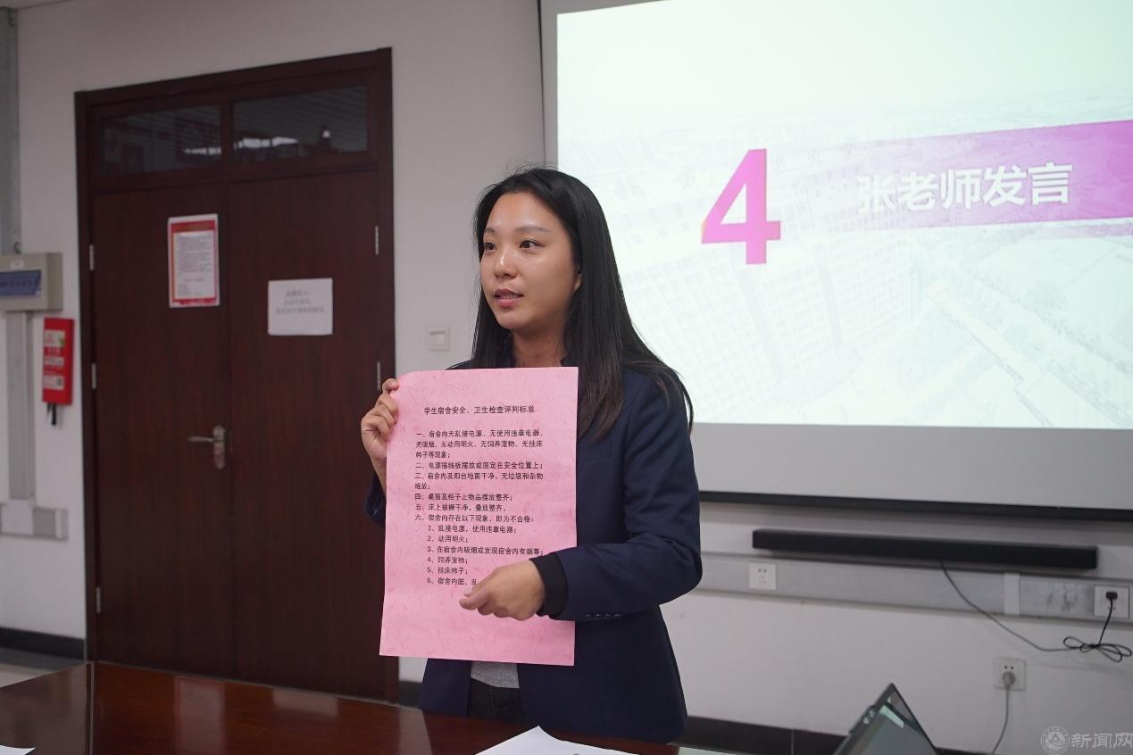 公寓管理部門張雪老師以“規范+引導”為核心,系統解讀宿舍衛生標準、安全管理細則與行為規范,既明確考核要求,更強調衛生安全與身心健康、集體生活的關聯,引導新生樹立規則意識與集體責任感,為宿舍文化建設奠定基礎。