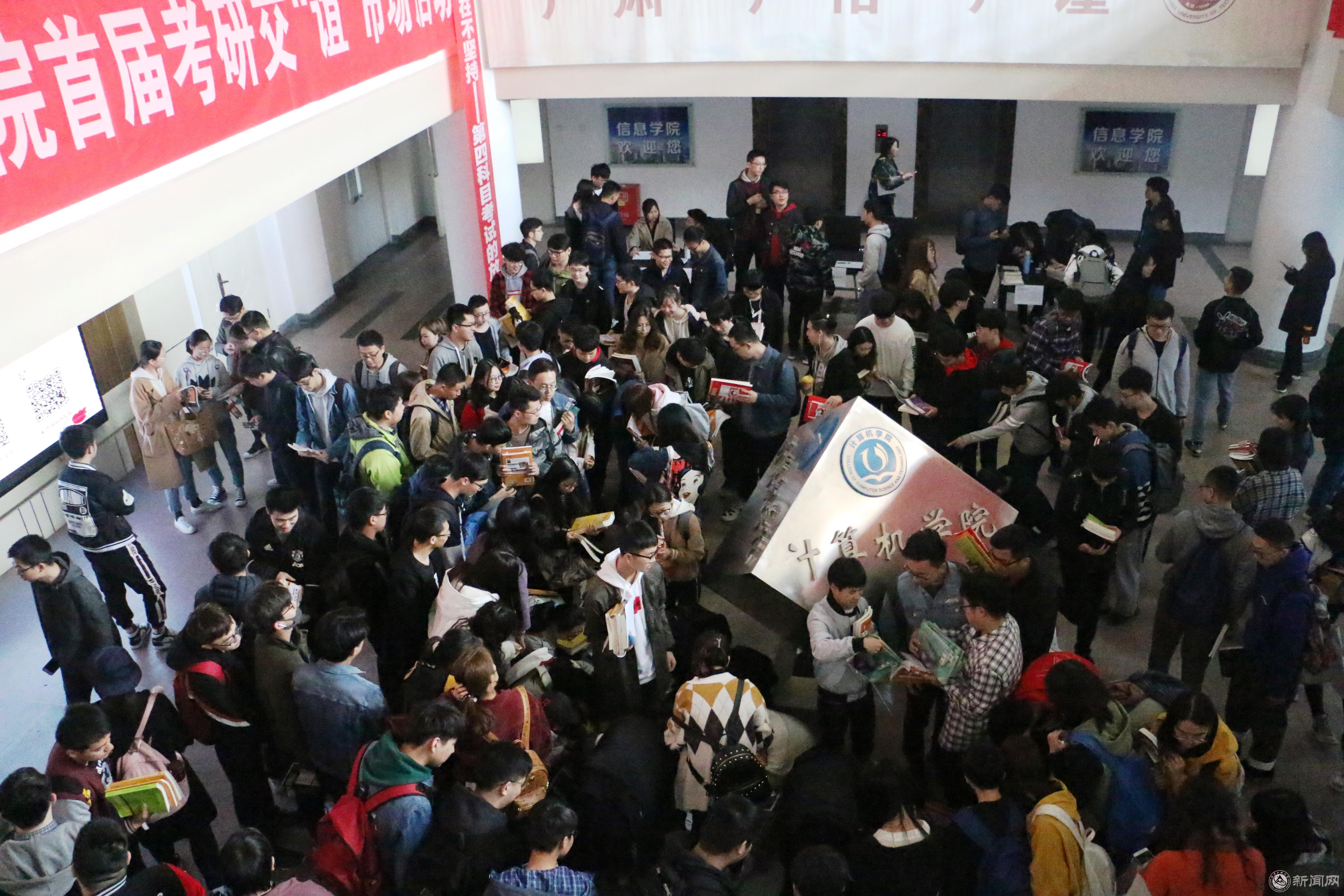 活動伊始,院長馬禮簡要總結了學院近年的考研成績,分析了當前的考研形勢,鼓勵同學們要樹立信心、梳理信息、整合資源,做好考研經驗的交流和傳承,為備戰2020年考研做好充分準備。隨著馬禮院長宣布信息學院首屆考研交“誼”市場活動開幕,兩條包含激勵的條幅從天而降:“考研贏在起跑線——第一志愿院校的選擇;考研輸在不堅持——第四科目考試的放棄”。