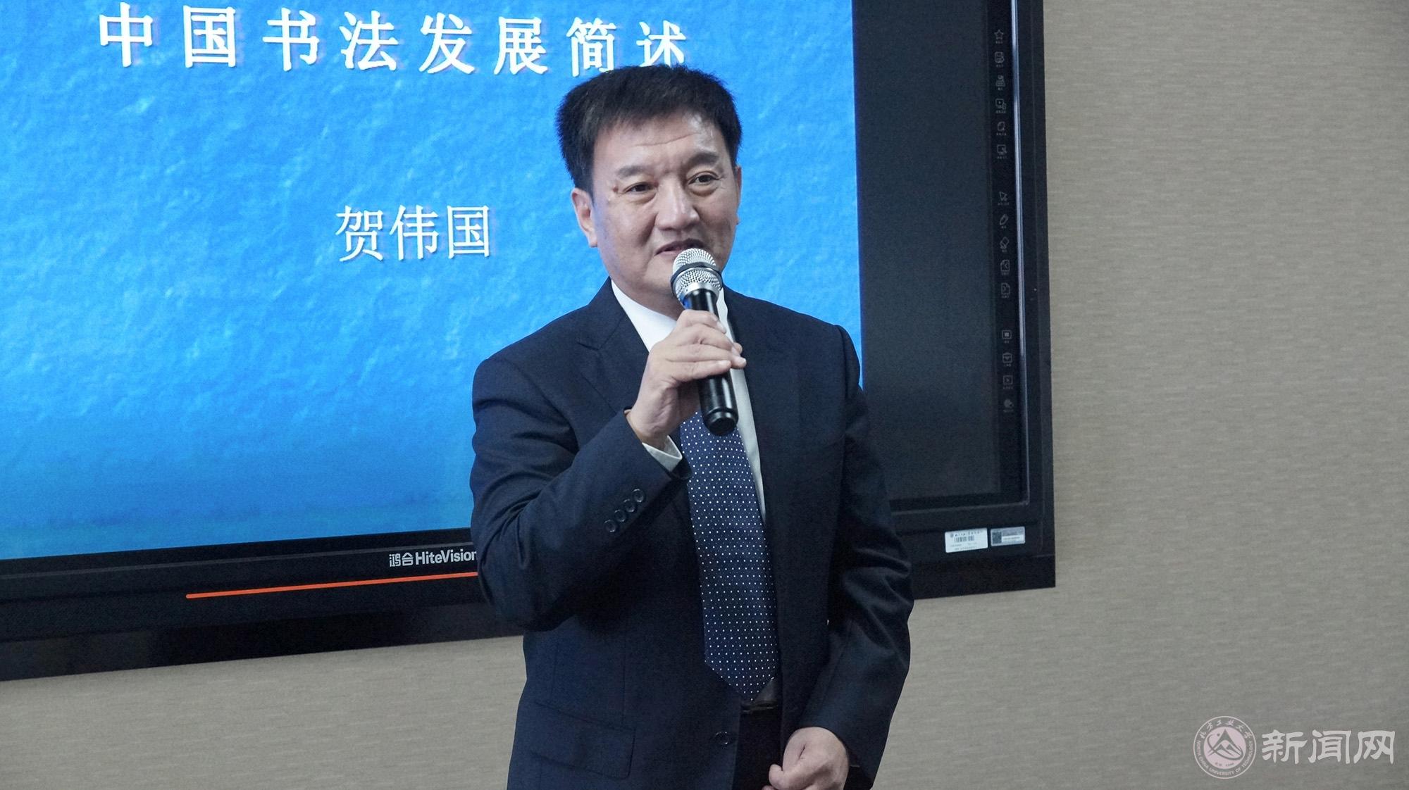 交流活動由文法學(xué)院中文系主任王德巖主持,日語系梁長歲老師擔(dān)任翻譯。國家大學(xué)生素質(zhì)教育基地、文法學(xué)院領(lǐng)導(dǎo)及師生,校書畫協(xié)會,賀良樸藝術(shù)研究會賀偉國會長及部分學(xué)員,與全日本書藝學(xué)院訪華團(tuán)一行17人進(jìn)行了學(xué)術(shù)和藝術(shù)交流。日方代表介紹了日本書法和書法教育的歷史沿革及現(xiàn)實發(fā)展,展示了日本當(dāng)代書法作品。賀偉國會長做了《中國書法發(fā)展略述》的精彩講座并進(jìn)行了生動的現(xiàn)場書法教學(xué)。