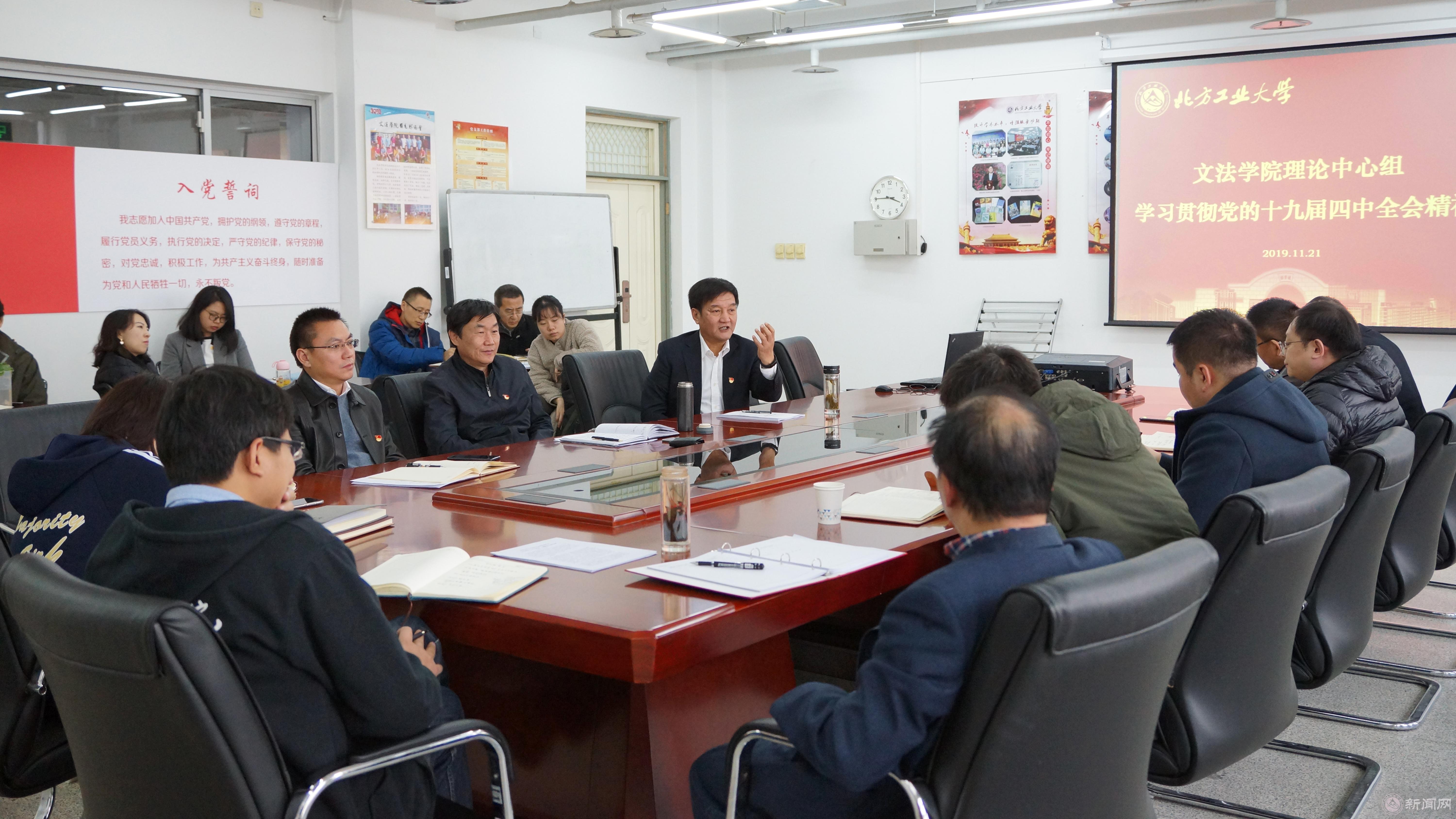 會上,劉澤軍院長帶領大家一起學習了《中國共產黨第十九屆中央委員會第四次全體會議公報》和《中共中央關于堅持和完善中國特色社會主義制度、推進國家治理體系和治理能力現代化若干重大問題的決定》,并從專業角度,以資深法律人的視角,對《公報》和《決定》中有關中國特色社會主義法治體系、社會主義法治國家和中國法律治理體系建設等內容進行了解讀,并結合學術研究和教學工作,跟大家一起探討如何在學習黨的十九屆四中全會精神中找到我們文法人的發力點和落腳點。劉院長強調,改革開放40年來,我國法律制度體系更加清晰,執行層面也更加完善。我國既從外部法律制度層面不斷拓展規則完備之路,又通過內控機制調節政府之權力,這種治理方式的優勢在黨的十九屆四中全會精神中充分體現出來。在這個過程中能夠更加清晰地看到我們學術研究的落腳點——“中國之治”。在學術研究的過程中,我們要注重跟進主旋律,運用中國話語,梳理中國經驗,探索中國模式,要在不斷積累過程中形成自身的學術特點和研究特色。