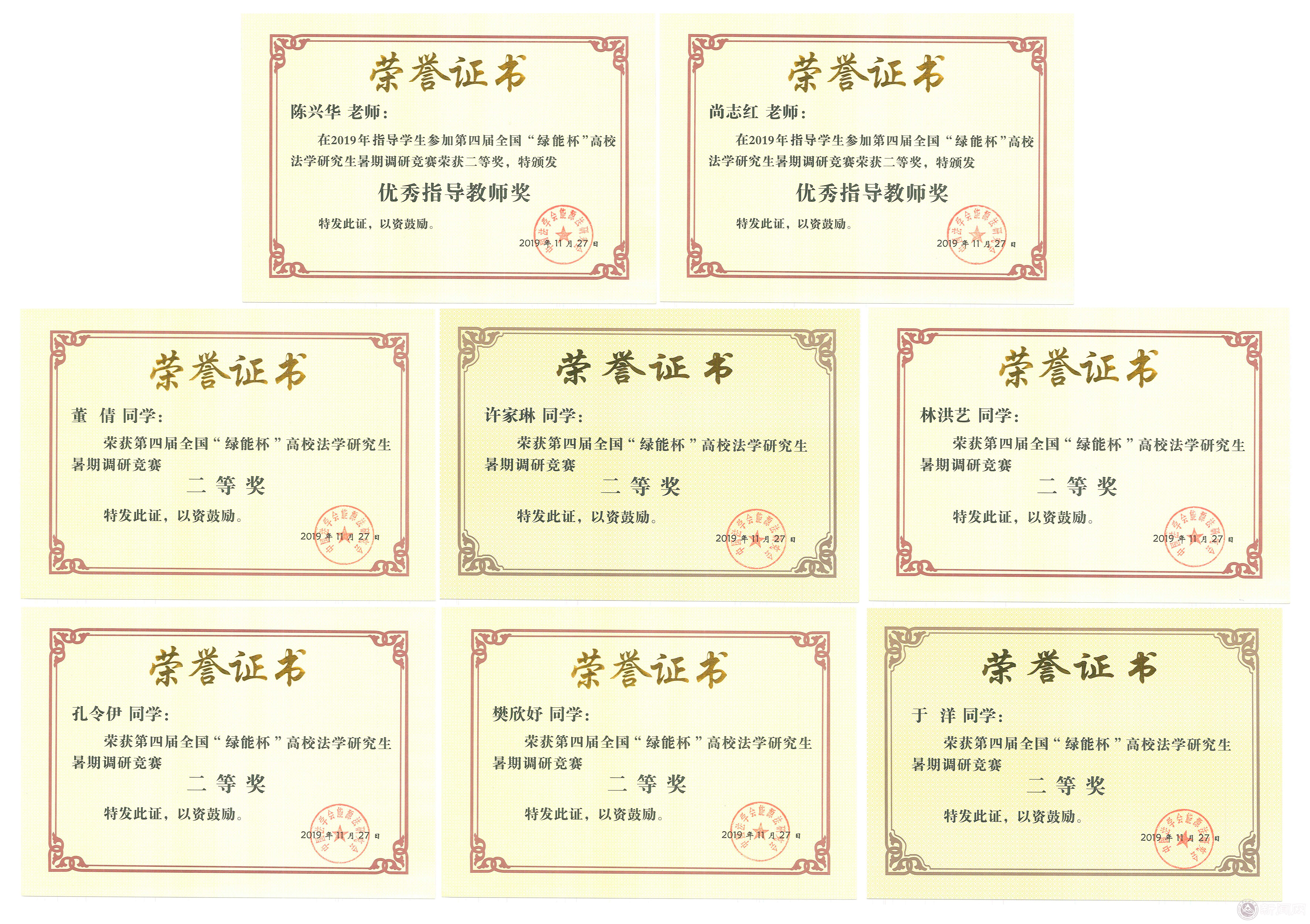 日前,由中國法學會能源法研究會主辦的第四屆全國“綠能杯”高校法學研究生暑期調研競賽結果正式揭曉,我校師生在21家參賽高校中脫穎而出,斬獲二等獎,來自文法學院法學專業研究生董倩、許家琳和本科生樊欣妤、孔令伊、林洪藝、于洋等六名同學,陳興華、尚志紅兩位老師獲頒證書。