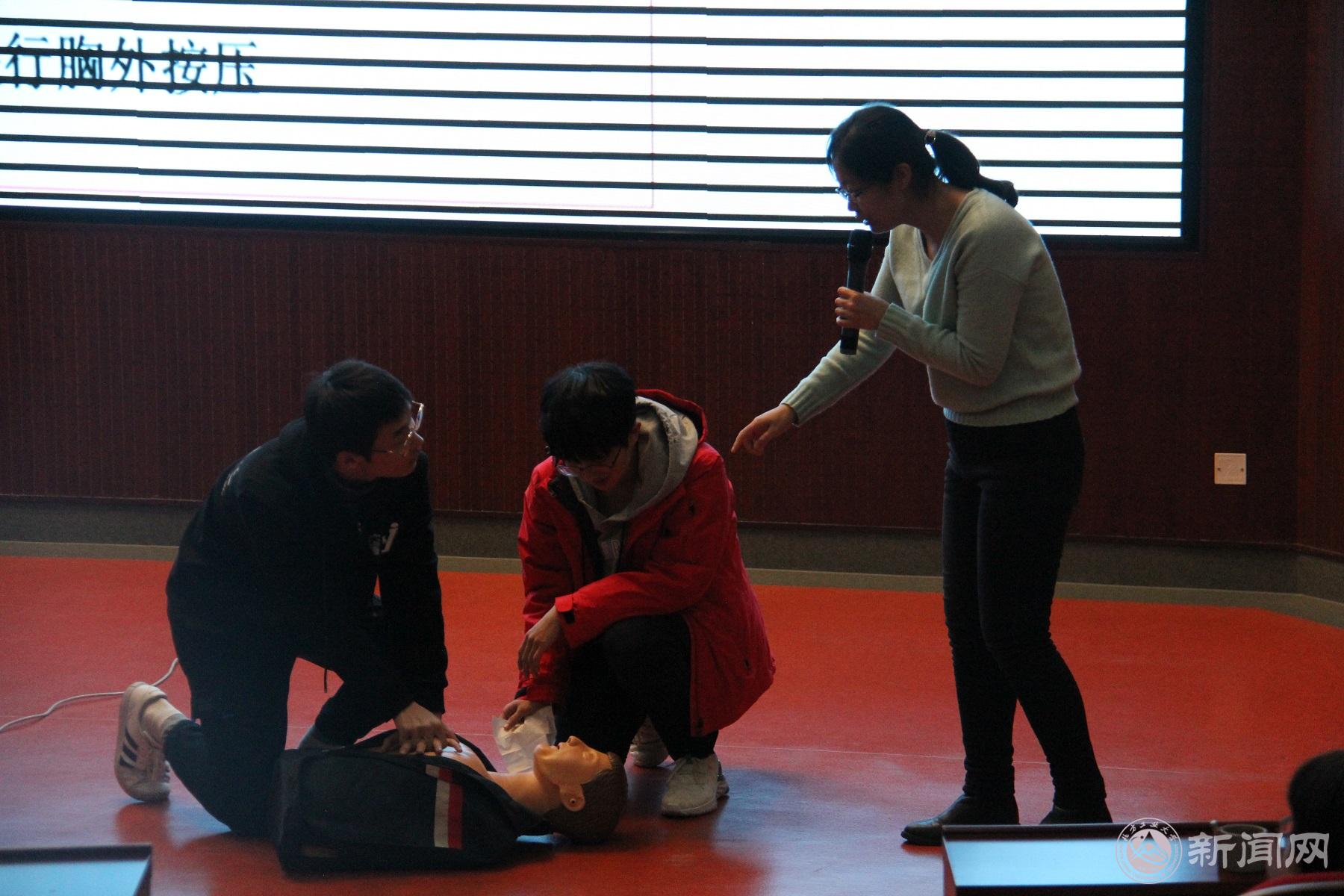 接下來張春燕醫師講解了院外心肺復蘇的開展和應用。張醫師引用“高以翔”等當下多個熱點猝死案例、結合國內外猝死的死亡率,概括了猝死的機制和原因,并提醒在場師生改善生活習慣、珍愛生命。同時她對心肺復蘇的流程做了詳細介紹:判斷情況、胸外按壓、開放氣道、人工呼吸。同時,張醫生對AED的必要性進行了普及并介紹了使用方法。張醫師邀請觀眾現場演示并對他們的急救動作進行糾正,讓學員們熟練掌握操作要領,并深刻認識到救護的重要性和必要性。