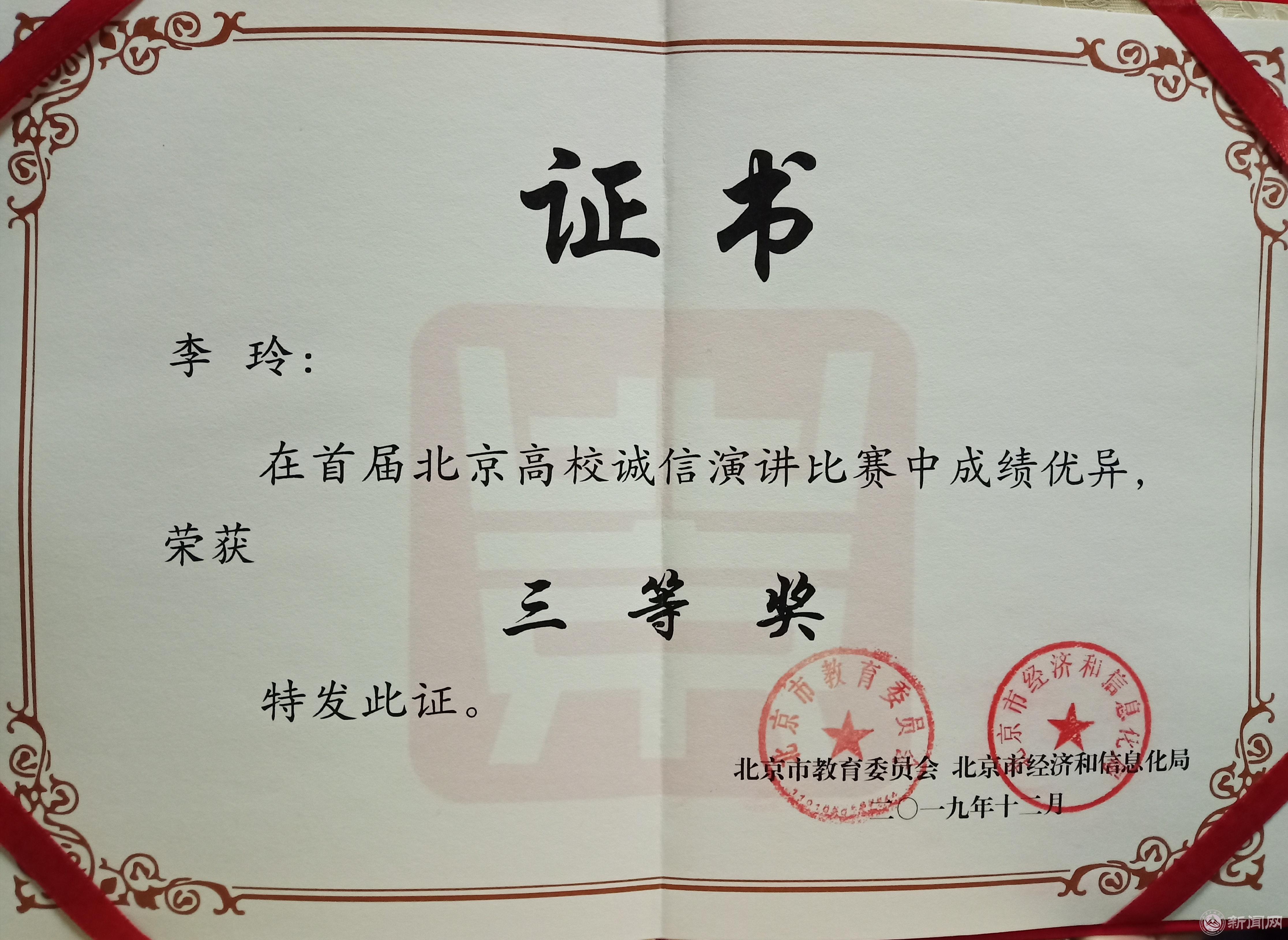 近日,以“誠信我踐行·風采耀京城”為主題的“首屆北京高校誠信演講比賽”在京舉行,來自我校文法學院的中文18-2班李玲同學最終獲得三等獎。