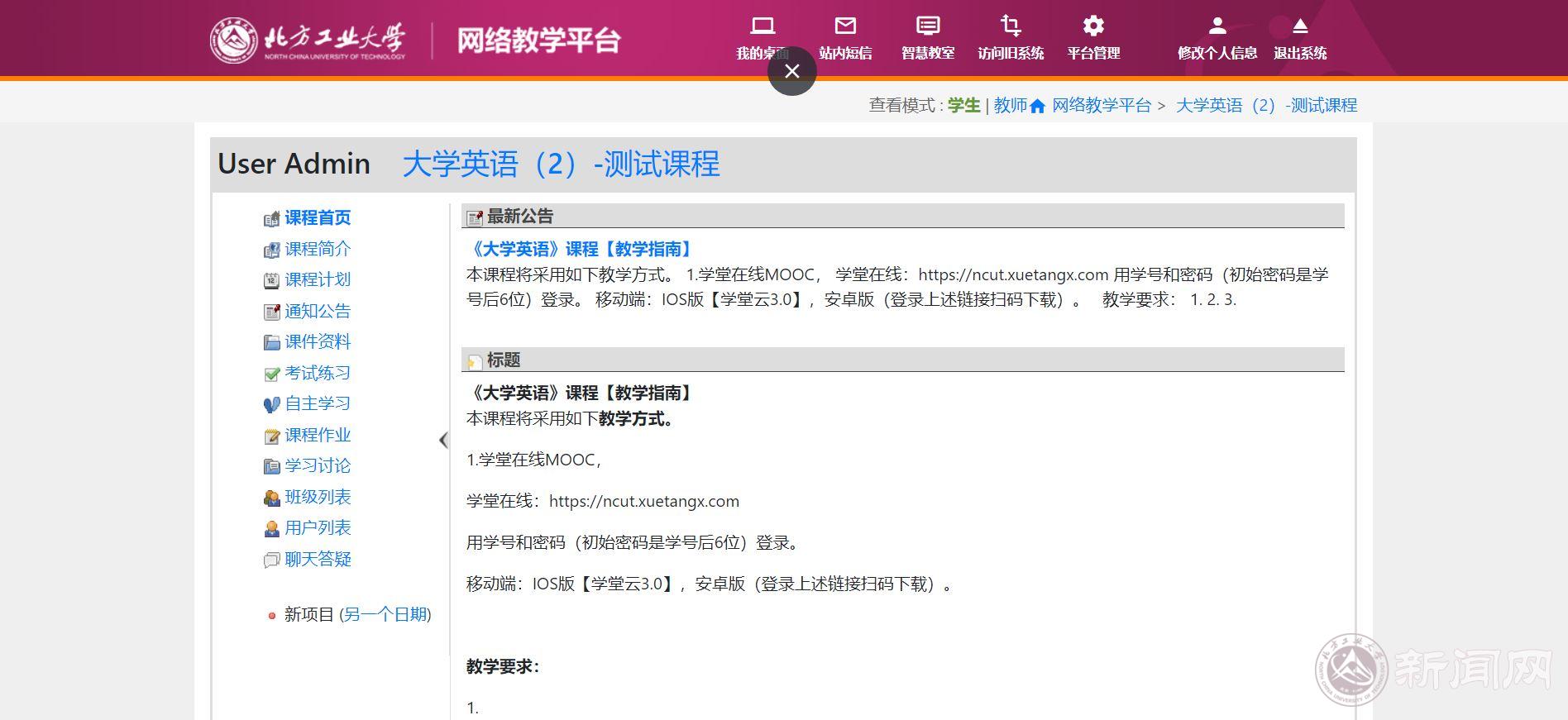 提前將春季學(xué)期課程信息導(dǎo)入多模式教學(xué)網(wǎng),并提前開(kāi)放外網(wǎng)直接訪問(wèn),網(wǎng)址為http://iclass.ncut.edu.cn/iclass/。學(xué)校多模式教學(xué)平臺(tái)作為延期開(kāi)學(xué)期間學(xué)校教學(xué)的摘要管理平臺(tái),所有課程在學(xué)校多模式教學(xué)平臺(tái)輸入課程基本要素,也建議老師盡可能利用多模式教學(xué)平臺(tái)課件、作業(yè)、考試等功能開(kāi)展教學(xué)工作。