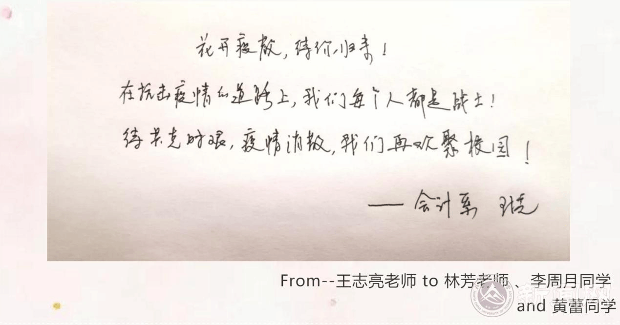 “豈曰無衣、與子同袍”。身在湖北的13位師生所在黨支部、年級和班級的黨支部書記、輔導員以及班導師們一對一通過手寫祝福語的形式,為他們及其家人送去問候與祝福。大家深信,雖然疫情暫時隔斷了彼此的重逢,但是大家始終手挽手肩并肩,待春暖花開戰勝疫情之時,一定能再次相遇在美麗的工大校園和圣潔的勵學樓前。