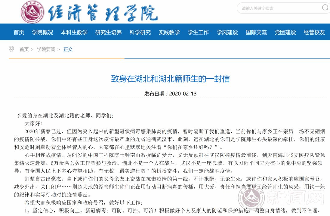 當日,學院發布了《致身在湖北及湖北籍師生的一封信》,向身在湖北地區的13位師生傳遞學校和學院的關注、關心和關愛。信中從“心手相連戰疫情”到“荊楚自古出豪杰”,傳遞出當前學院“心頭最深的牽掛”,號召大家堅定信心、積極向上、聽從指揮、攻克難關。