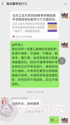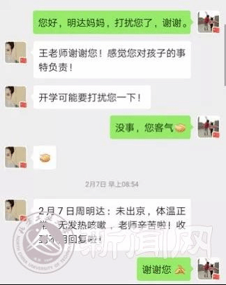 輔導員們密切關注著每名學生的朋友圈,時刻提醒學生不去人員密集的公共場所,盡量減少不必要的聚會聚餐等活動。通過在學生群和朋友圈的不間斷提醒,讓學生知曉和踐行學校“不離家、不返校”的防控要求。大家還從“學生輔導員”變身“防疫咨詢熱線”,電控學院輔導員王磊逐一向學生及其家長發送溫馨提示,得到了家長的高度贊揚,并評價為“對孩子的事特負責”。文法學院輔導員尤博在自己的微信圈里“以身作則”,通過曬圖的方式引導學生們在家里“多讀書、多寫作、多鍛煉”。